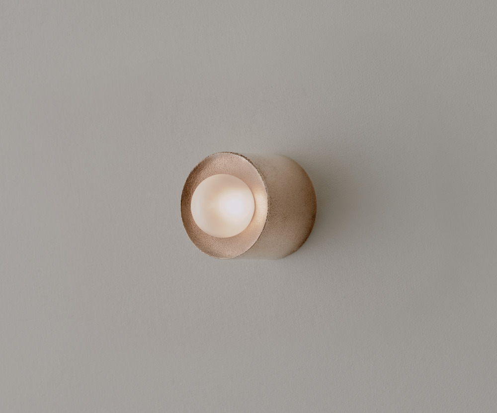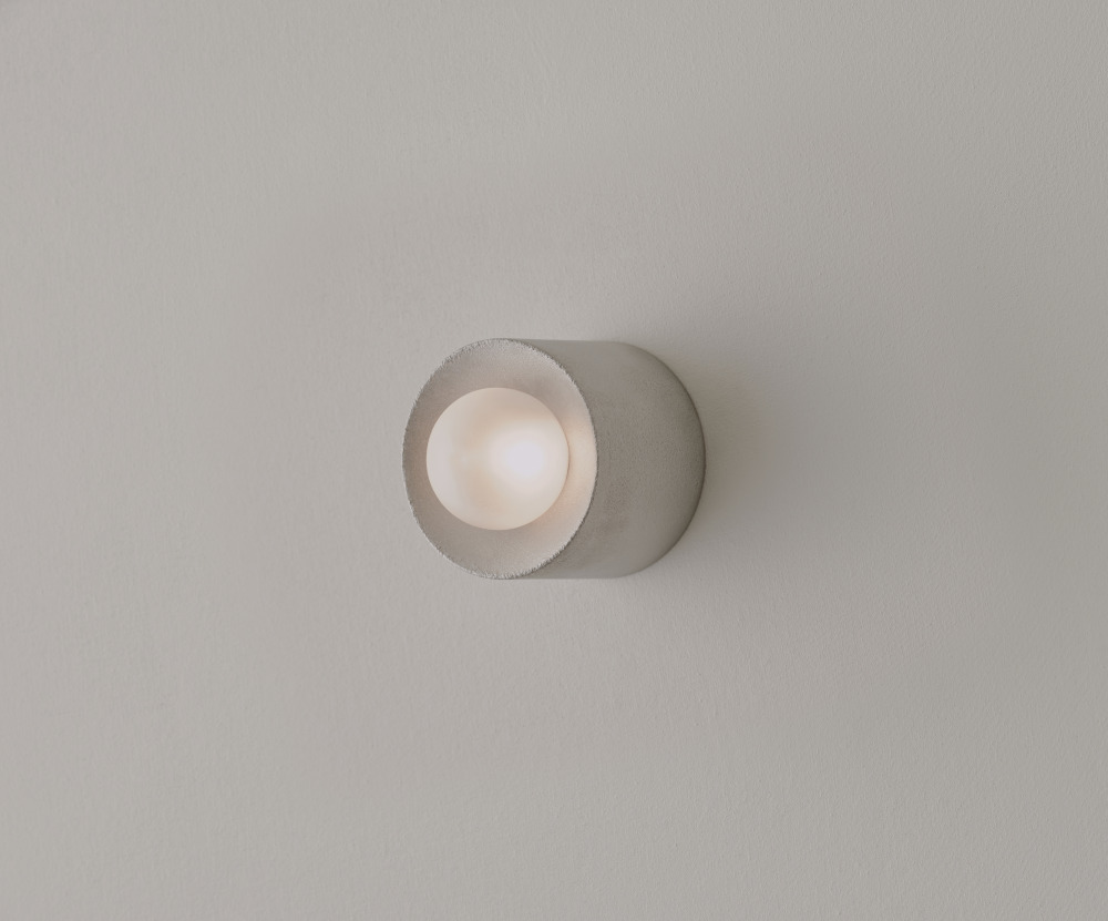 The Anton series is an exploration of cast materials, hand-worked to capture the qualities of each finish. The central lamp illuminates the face and reflects light.