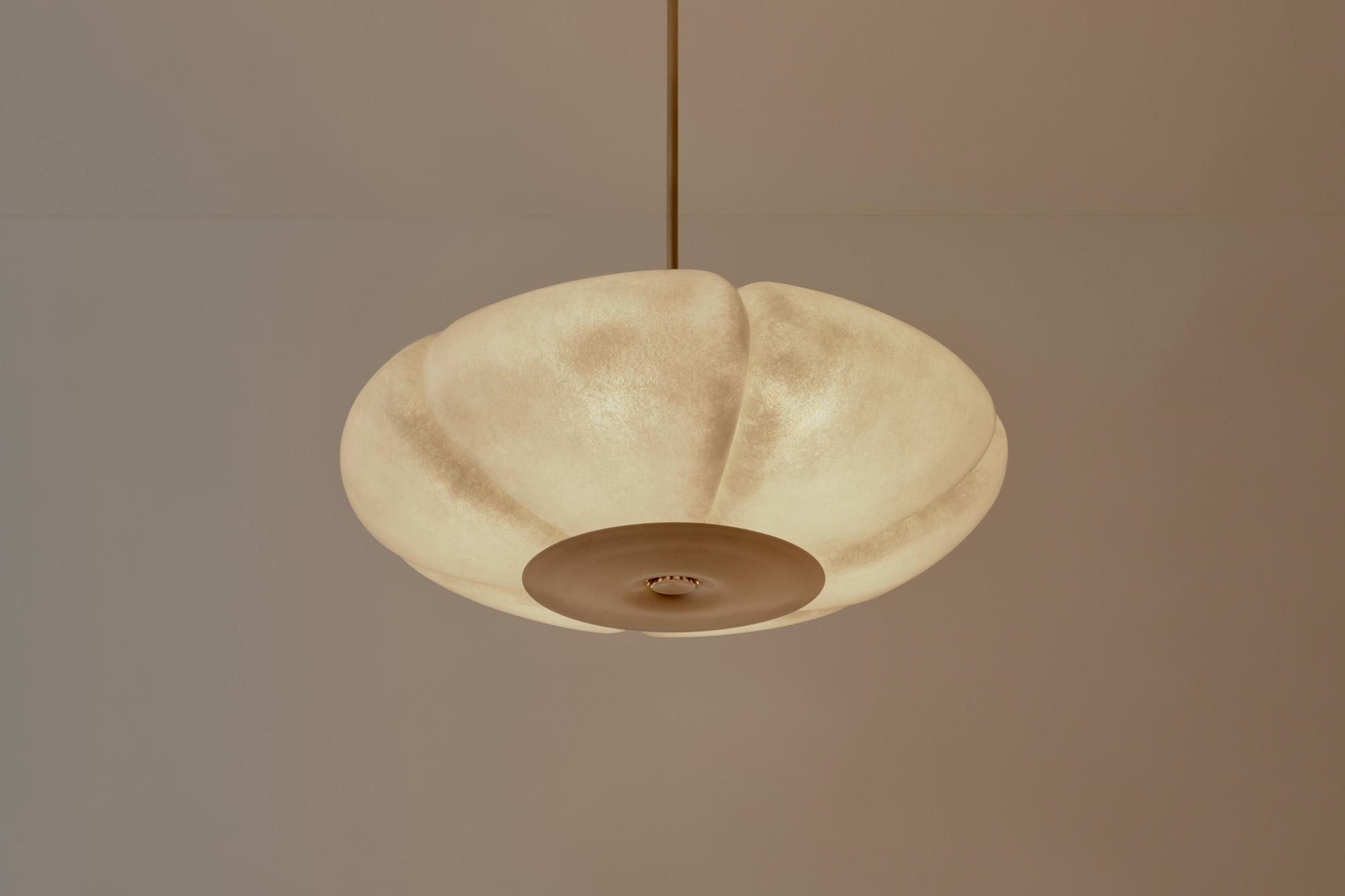 The result of a minor calamity, a fixed constraint, creative simpatico and a long history of friendship, Me and You is a collection of lighting objects by Melbourne based Volker Haug Studio and design practice Flack Studio. As the name suggests, Me and You speaks to the collaboration process, but also to the inherent interplay between light and space. Fleur's richly textured fibreglass segments are held together by two spun brass plates, forming an airy and captivating whole.
