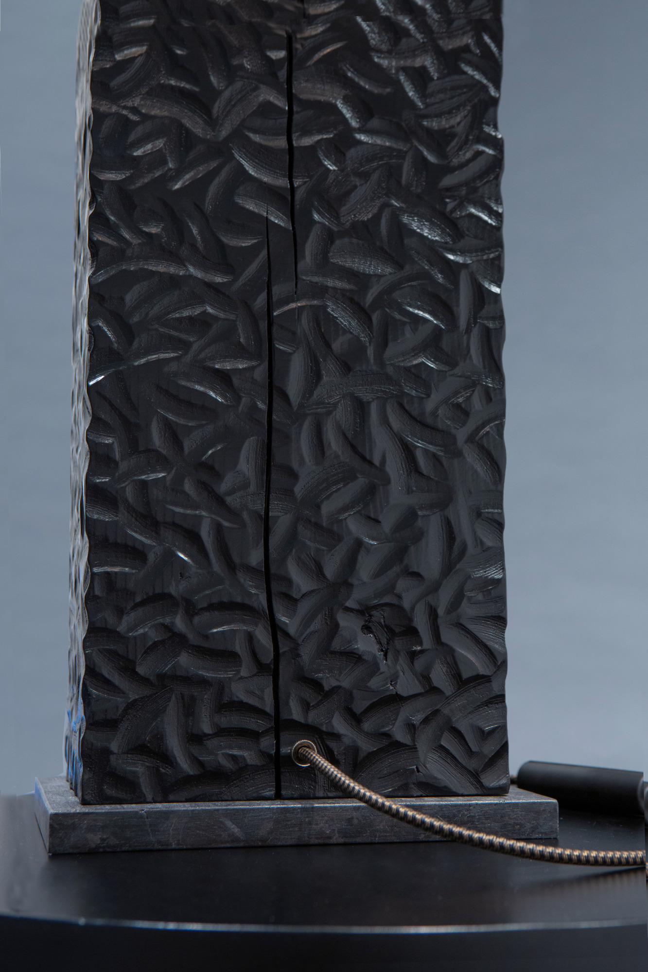- Anchoring the piece is a recycled slab of black granite