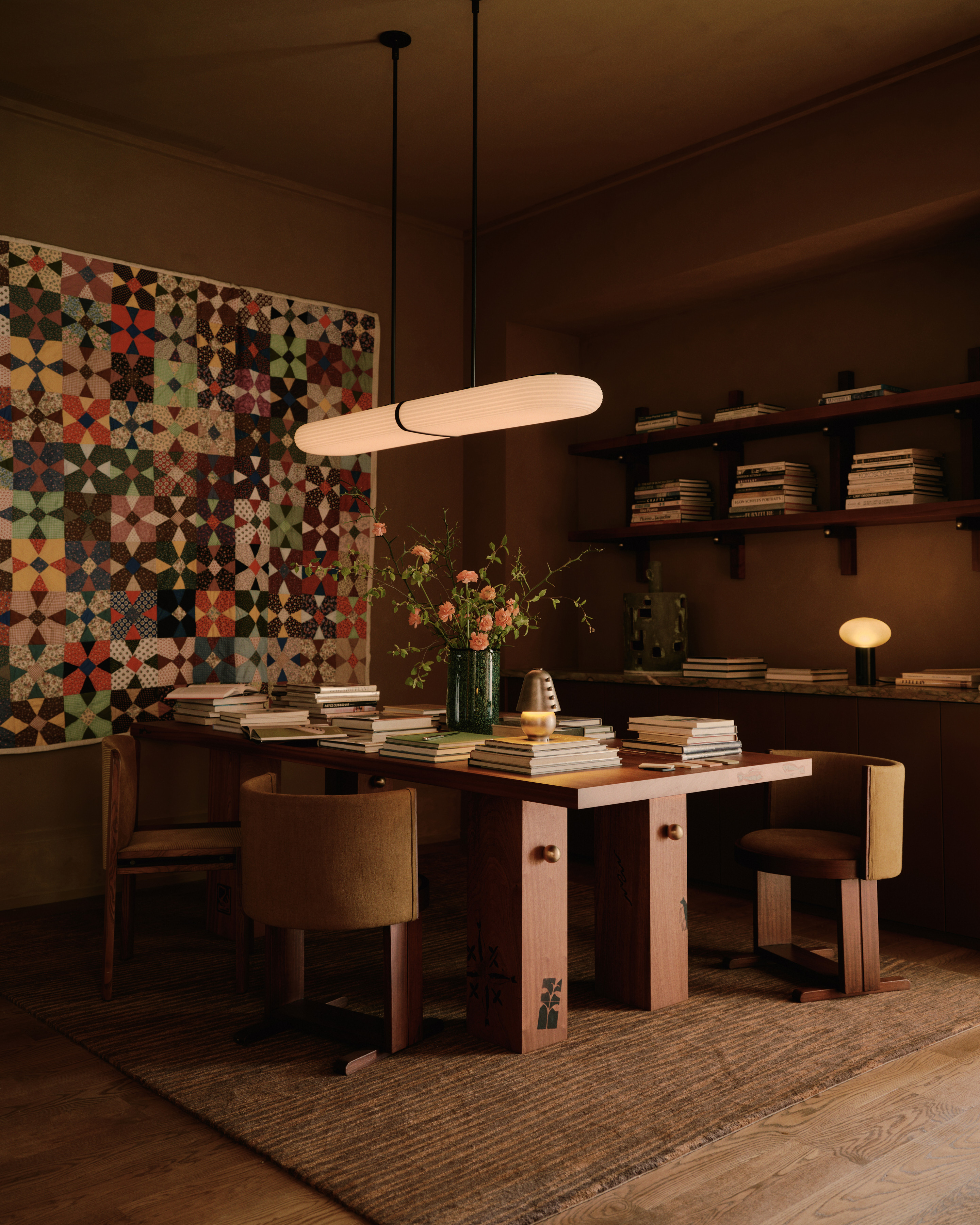 Found within a grand Tribeca loft, the Quarters project affords Ozemba the ability to showcase his prowess in interior design; he entered the field after graduating from RISD, while Hung went on to product design. Eventually they came together to found In Common With in 2018; a contemporary-minded studio that elevates its pieces by honouring craft practices including the centuries-old fazzoletto technique – a Venetian glassworking method which gives a range of their lighting designs a dynamic flared effect.