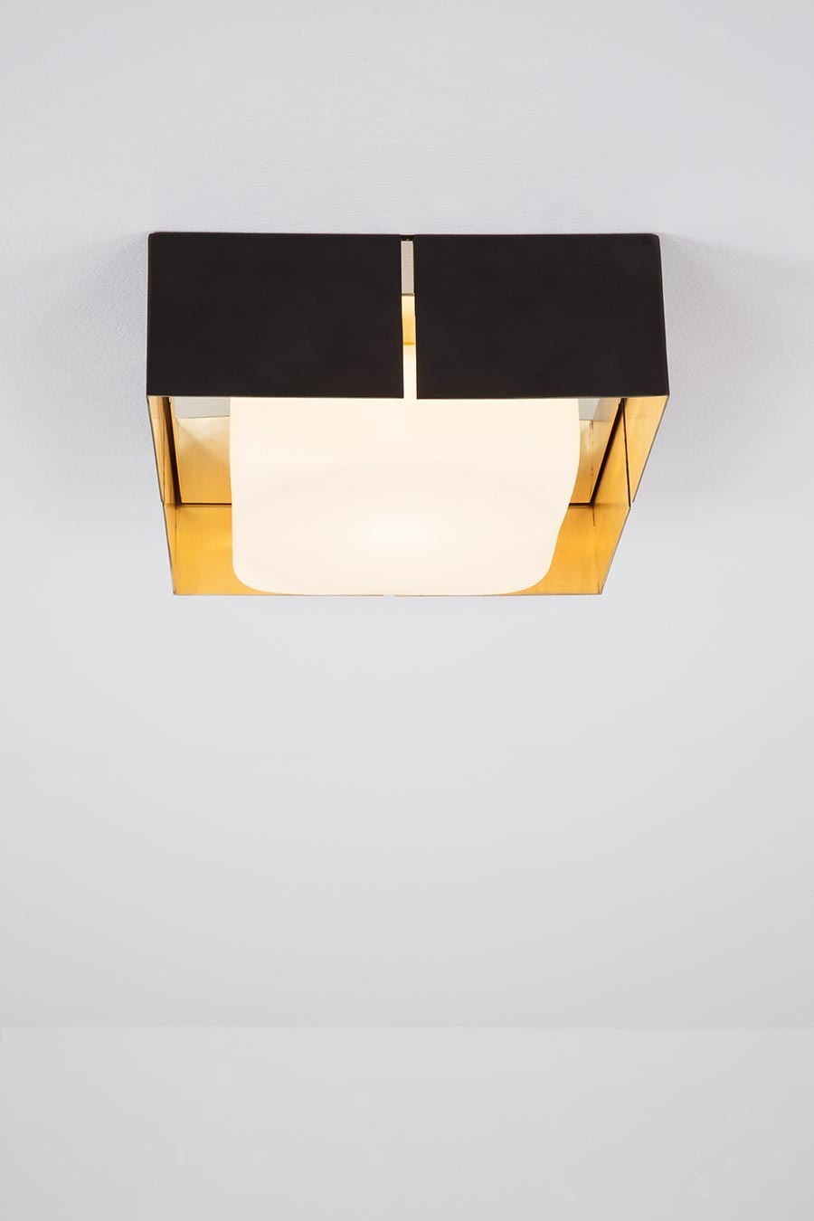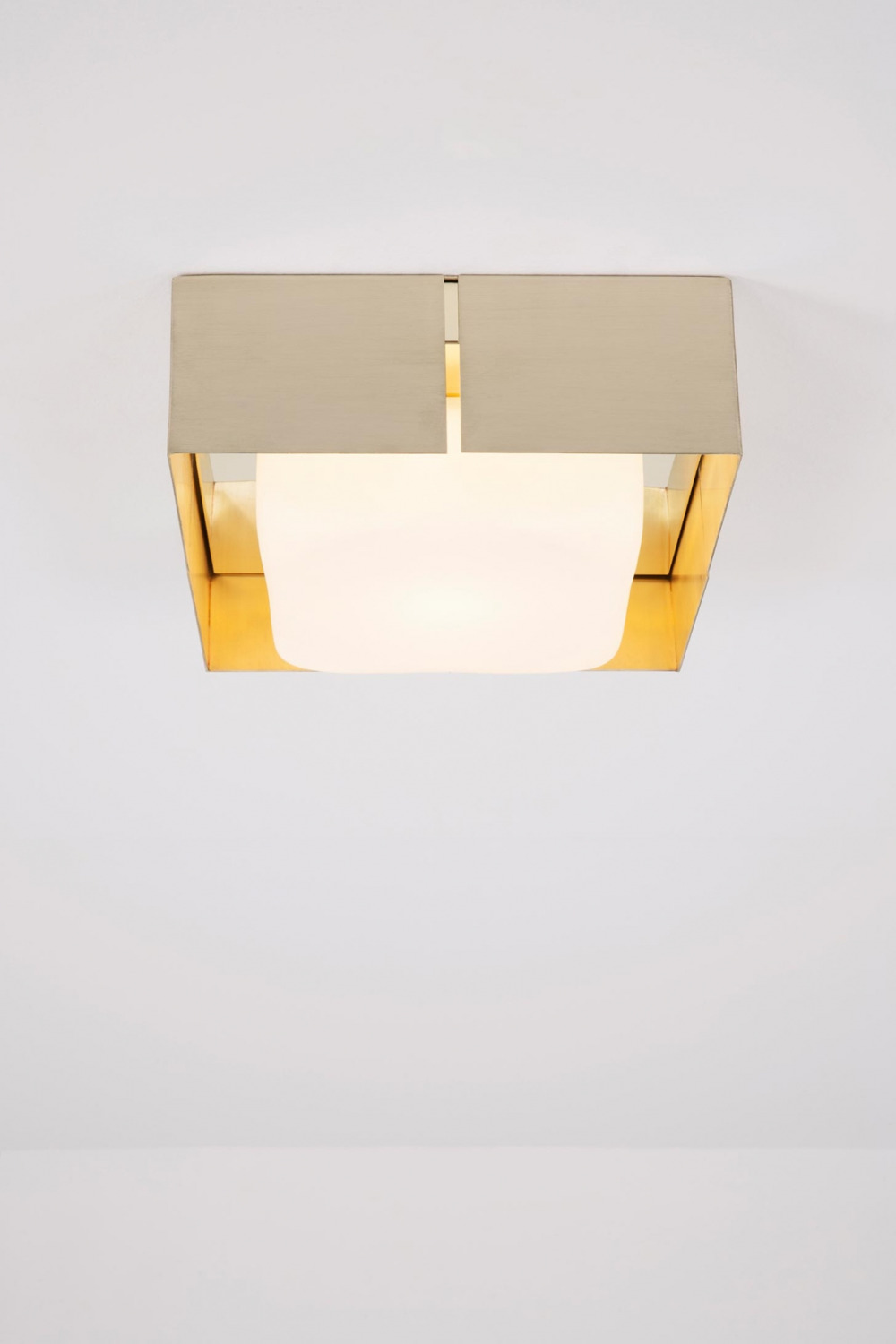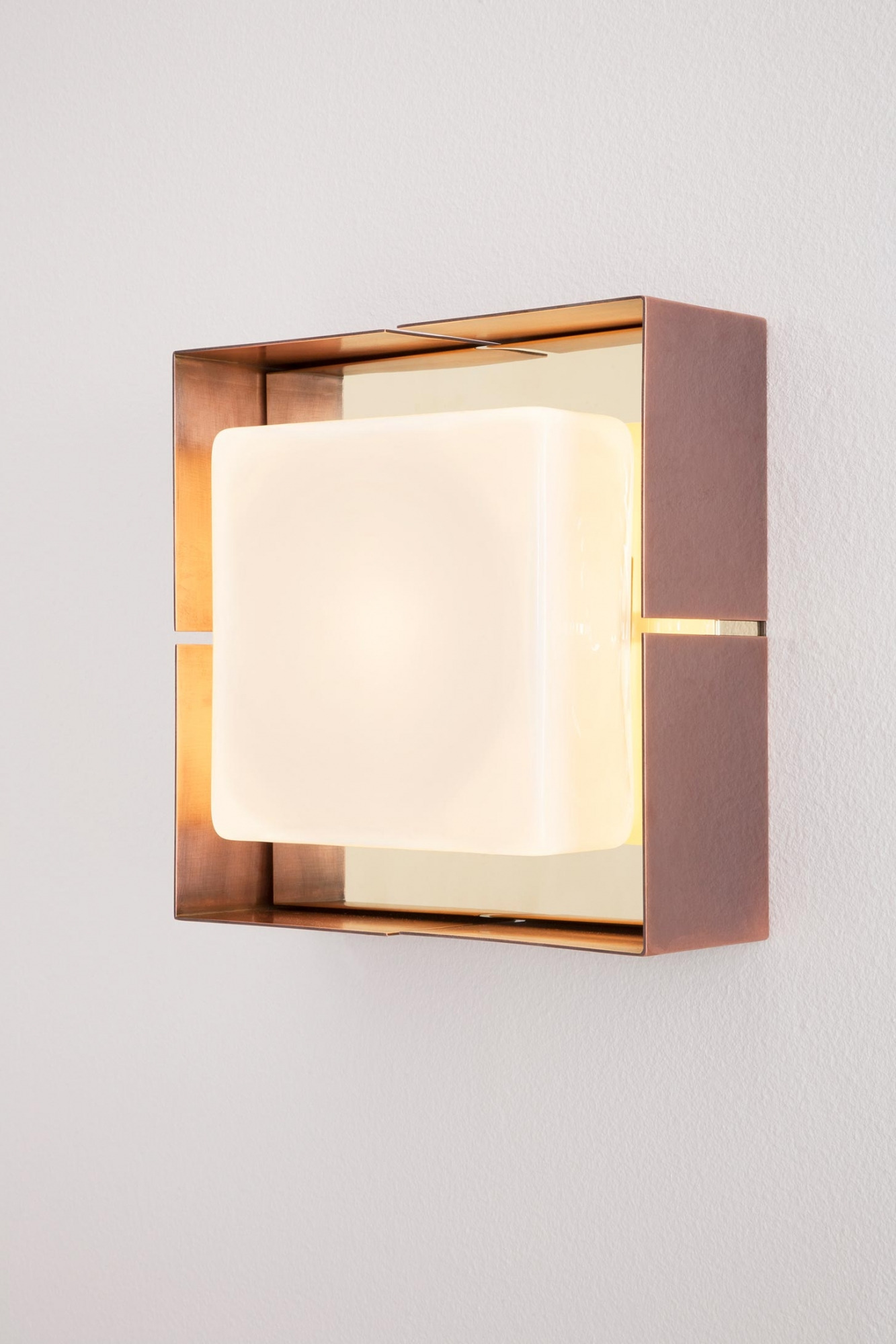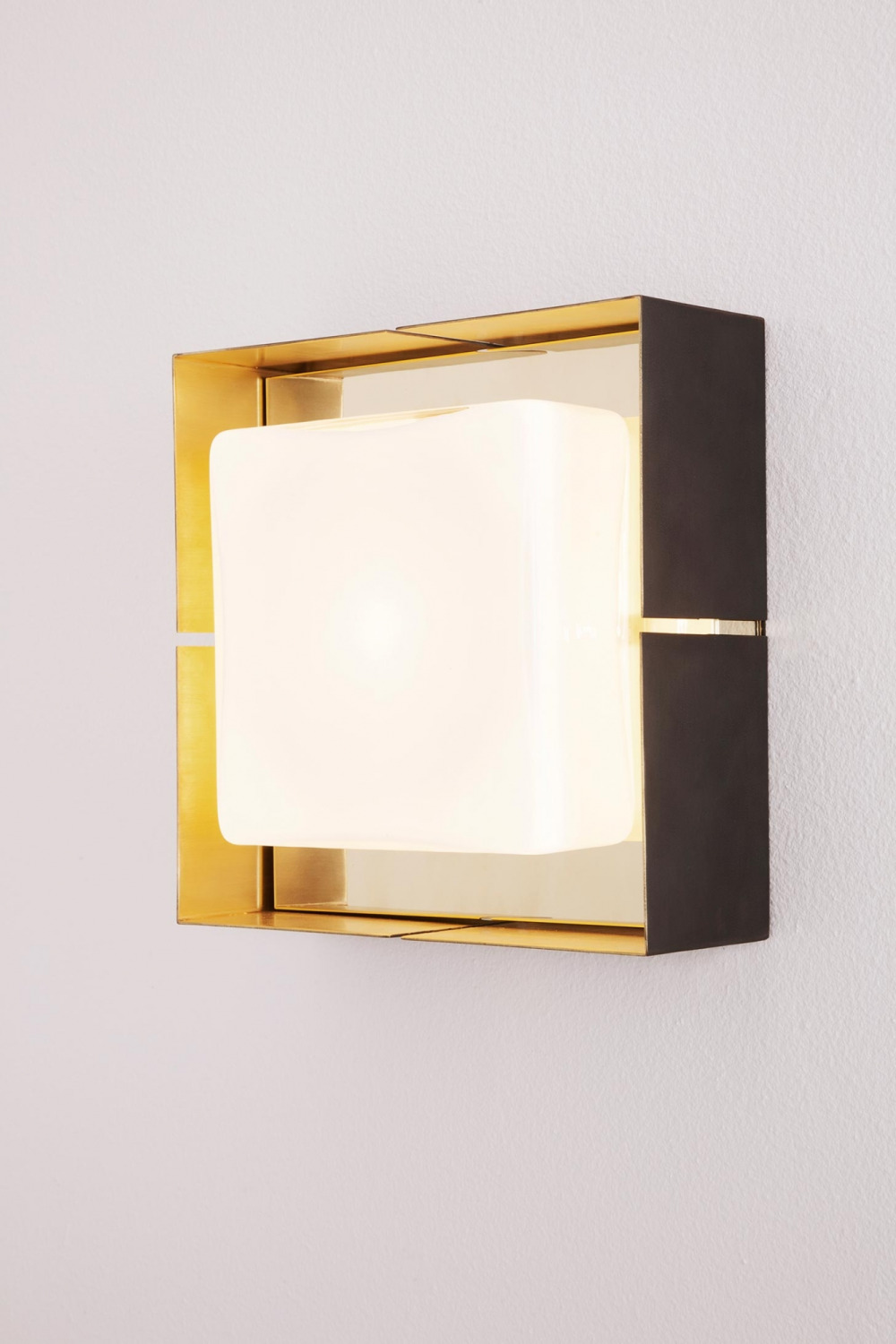 The Lune Sconce features a hand blown opal and sandblasted square glass shade mounted within a two tone brass frame. The interior is finished in satin brass. Exterior finish options are blackened brass, burnished copper, satin brass, or satin nickel.