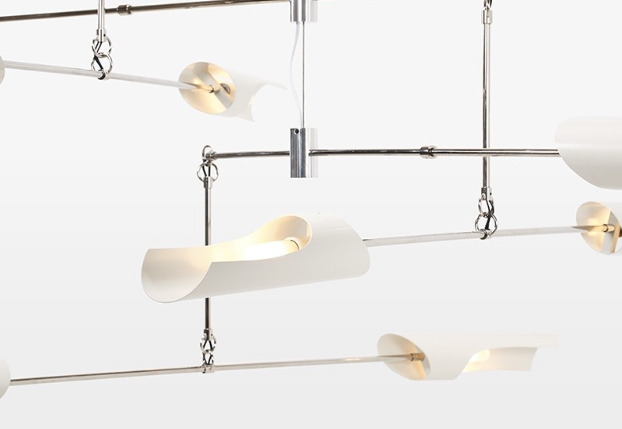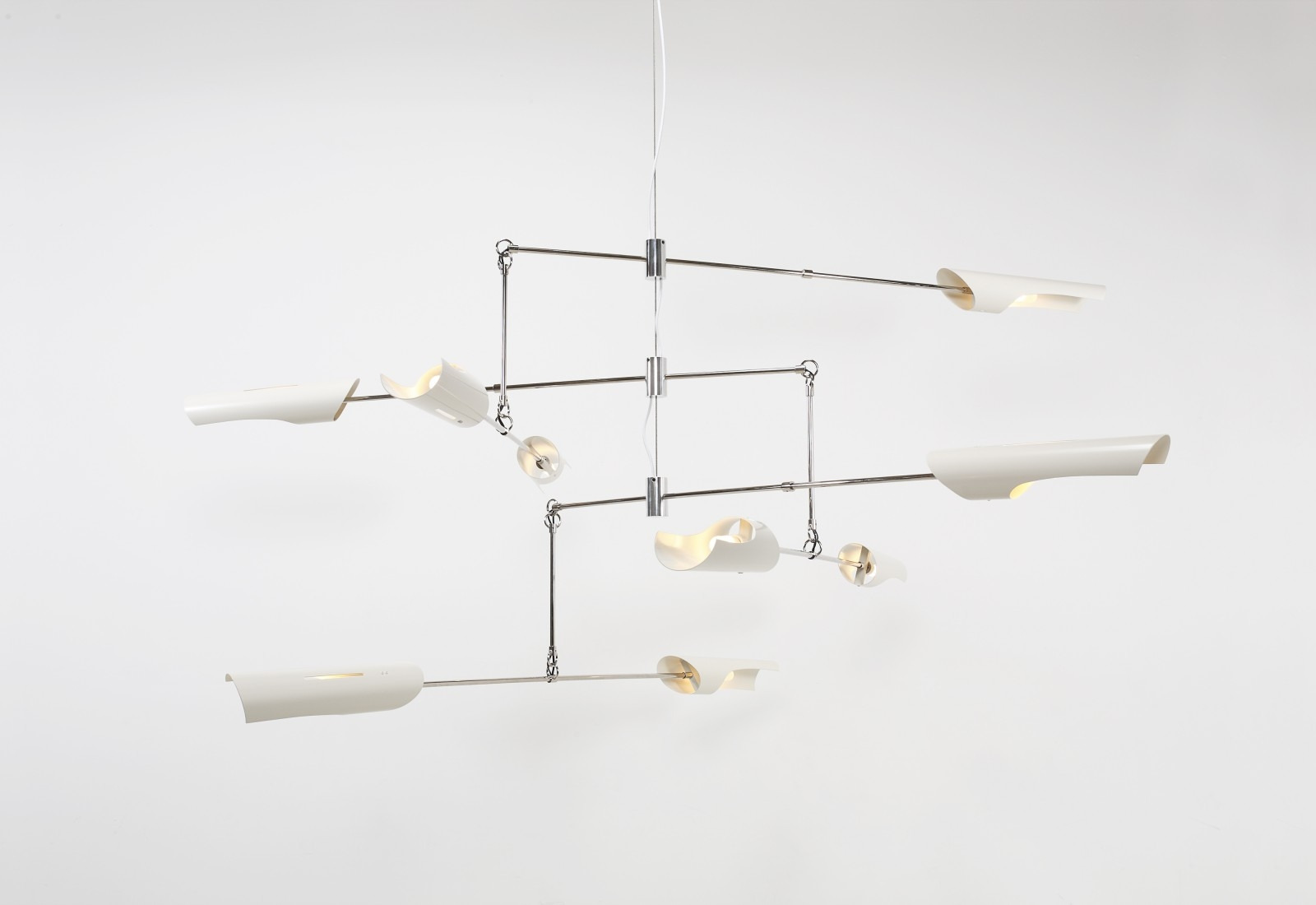 The Torroja Mobile is custom-crafted to client specifications, built upon the frame of a Hanging Mobile. With a minimum of two tiers, this suspended fixture can extend both horizontally and vertically. Each tier is comprised of three segments, balancing on an asymmetrical axis to allow gentle movement. Torroja shades rotate 320 degrees to cast light up or down.