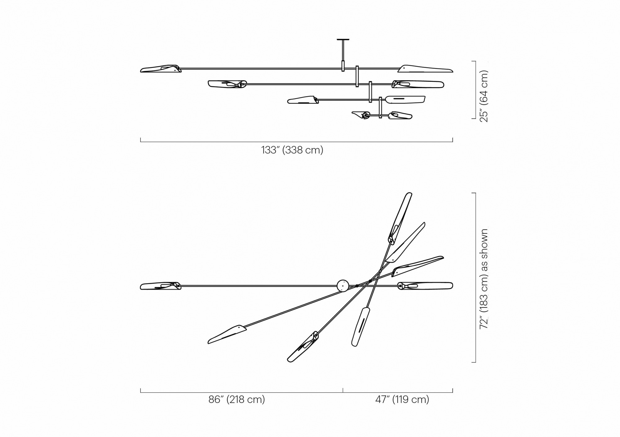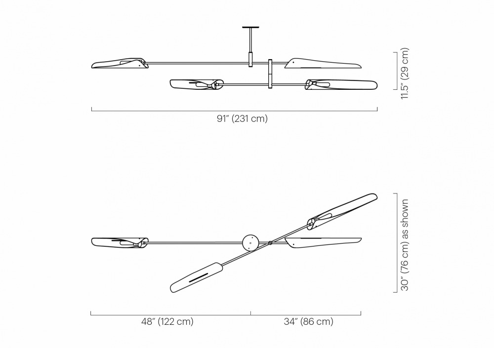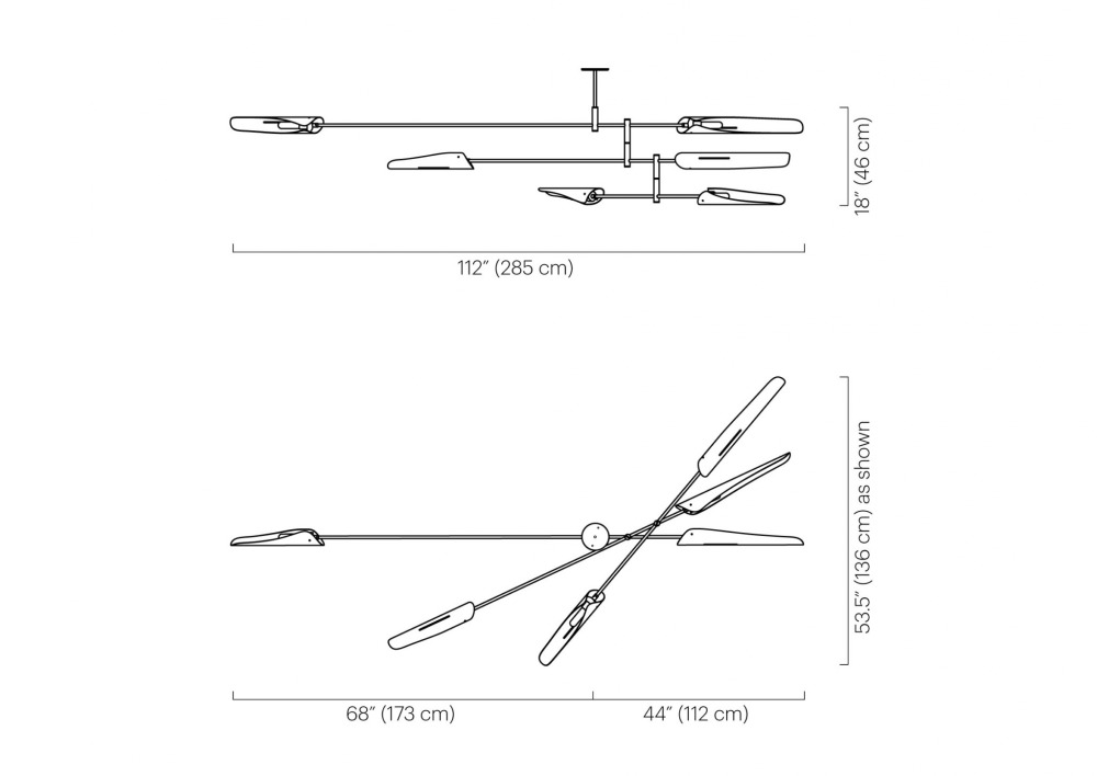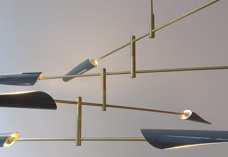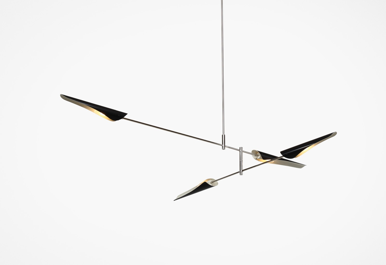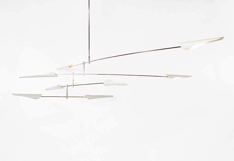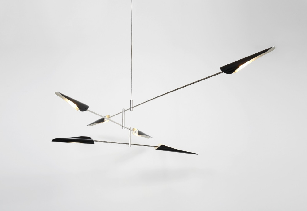 The Sarus Mobile is a carefully balanced fixture, featuring a combination of large and small Sarus shades on a plated steel frame. Powder coated aluminum shades are mounted on two tiers of differing lengths; each shade rotates 320 degrees to cast light up or down. Tiers scissor open when installed on site and arrangement is adjustable based on client specifications.