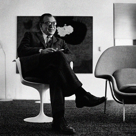 The son of architect and Cranbrook Academy of Art director Eliel Saarinen and his wife, textile artist Loja, Eero Saarinen studied fine arts in Paris and architecture at Yale before working on furniture design with Norman Bel Geddes and practicing architecture with his father in Ann Arbor, Michigan. He collaborated on several projects, including a plywood leg splint for the U.S. Army, with his friend, Cranbrook alumnus Charles Eames. He opened his own practice in Ann Arbor in 1950. Among the many buildings for which he is known are Dulles Airport in Washington, D.C., The Gateway Arch in St. Louis, Missouri and the TWA Terminal at Kennedy International Airport in New York. He was the recipient of numerous awards and the subject of many exhibitions.