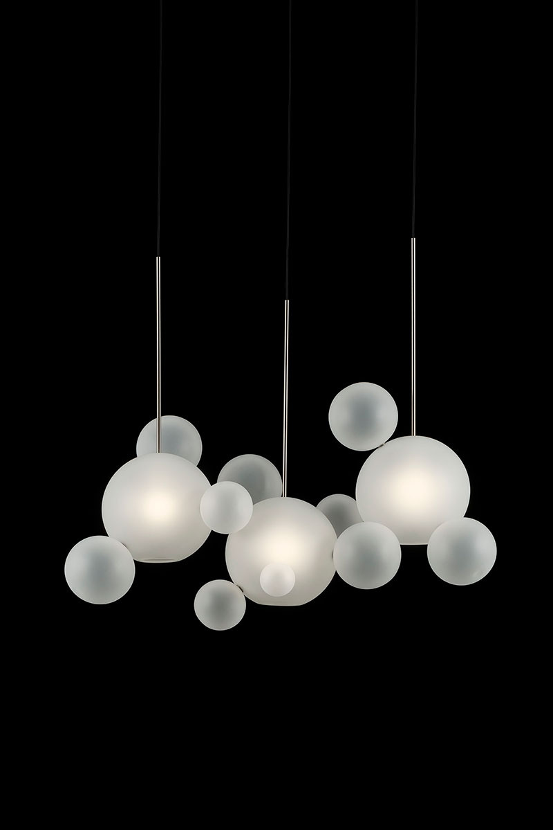 The Bolle Frosted inverts the perception of the Bolle project. Whereas Bolle play with the emptiness, Bolle Frosted work with the positive volume of the spheres, creating satellites that seem to grow and move together through the space. The Bolle Frosted lamps are hand blown by local Venetian artisans using the “a lume” technique.