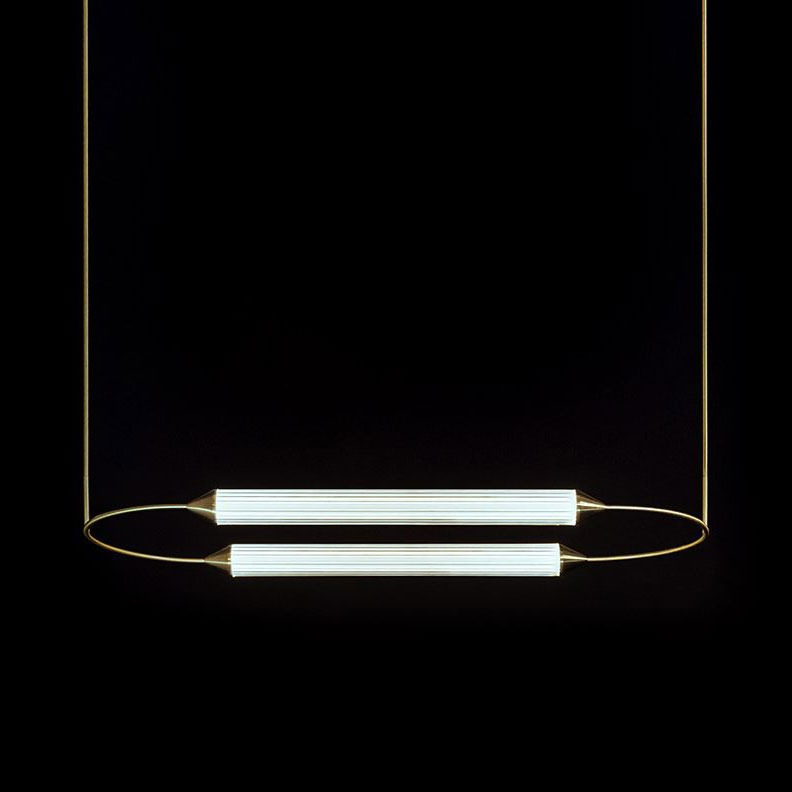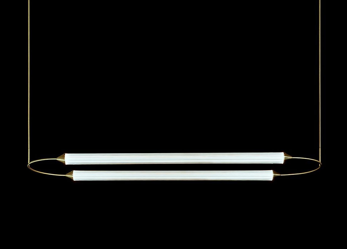 Lamps with slender thread-like structures in brushed brass, that change form to create infinite geometric compositions. The figure, suggesting circus gear, is interrupted by capsules that project continuous light. Each capsule, made in ribbed glass with extremities in brass, crafted with a lathe using a very refined technique that starts with a solid block of the material, conceals light guides used in the automotive sector that make it possible to connect the LEDs contained in the ends of the capsule, conducting the light along the entire length.