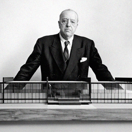 Ludwig Mies van der Rohe began his career working in his father’s stone masonry business. After an apprenticeship with furniture designer Bruno Paul in Berlin, he joined the office of architect Peter Behrens, whose work presaged the modern movement. In 1912, Mies established his own office in Berlin, and later became a member of the Deutscher Werkbund and Director of the Bauhaus. He immigrated to the United States in 1938, setting up a practice in Chicago. His buildings include the German Pavilion for the 1929 Barcelona Exposition, the Tugendhat Villa in Brno, Czechoslovakia, the Seagram Building, designed with Philip Johnson, a cluster of residential towers along Chicago’s Lakeshore Drive in Chicago, and the Illinois Institute of Technology campus, where he was the director of architecture.