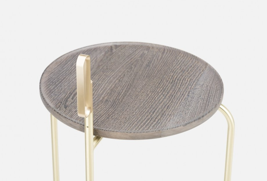 Brass base with timber top. Available in American black walnut, American white oak, or European Ash in a range of finishes