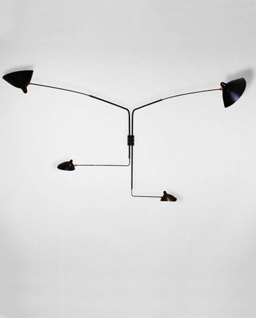 In 1953 Jacques Adnet hired him to design lighting fixtures, an art to which he devoted the rest of his life. Throughout the 1950s Mouille designed large, angular, insect-like wall mounted and standing lamps with several arms and smaller, more curved wall-sconces. Some of his best known designs from the period are his “Oeil” lamp (1953), “Flammes” (1954) and “Saturn” (1958). He worked to achieve a kinetic, sculptural aesthetic that evoked a sense of movement in space. He also claimed his lighting fixtures were “a reaction to the Italian models, which were beginning to invade the market in 1950,” and which he thought to be “too complicated.” His designs from this period were shown mainly at the Steph Simon Gallery in Paris. Towards the end of the 1950s the invention of neon tubes inspired Mouille to create a series of floor lamps that combined incandescence and fluorescence. These designs, called the “Colonnes” collection, had their debut at the 1962 Salon for interior design, and are some of his better known later works.