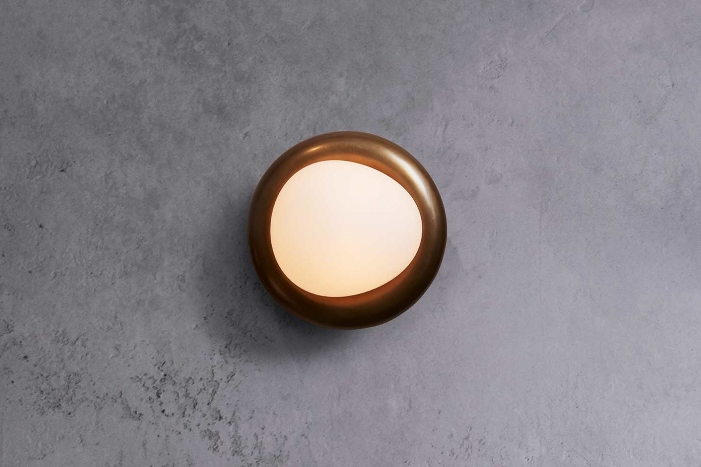 An organic clay sculpture that has been cast in hot-patinated bronze. The addition of hand-blown glass completes this sculptural light form.