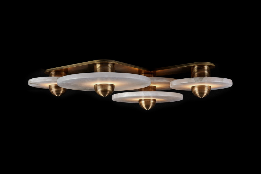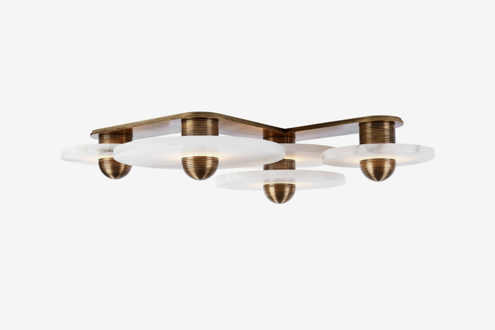 The translucent alabaster planes of the median shapes are intersected by a fluted brass form, referencing traditional Middle Easter Jewellery while pushing it through a futurist lens. The stone glows from a light source that remains hidden, illuminating the relationship between the solid and the permeable.