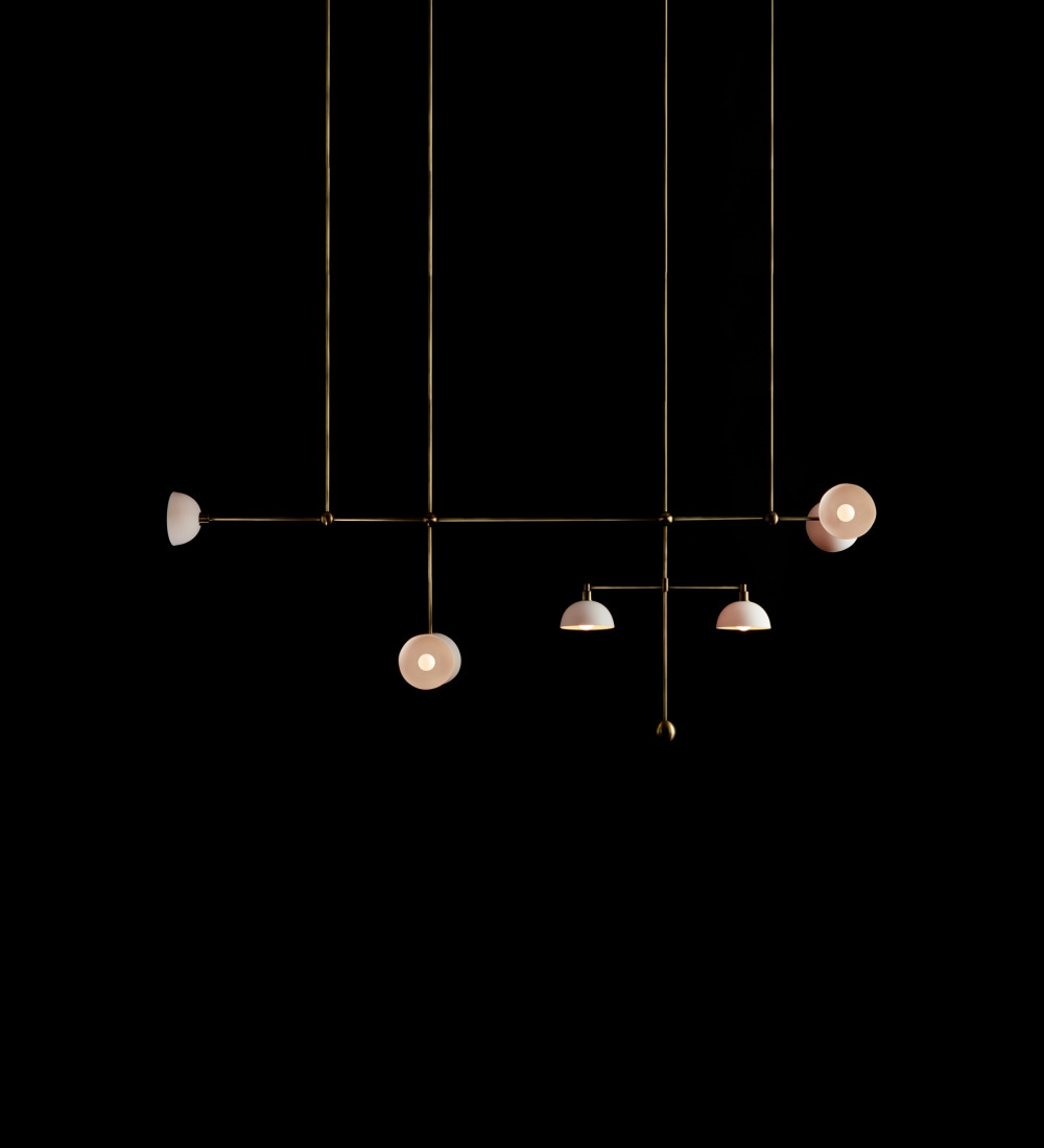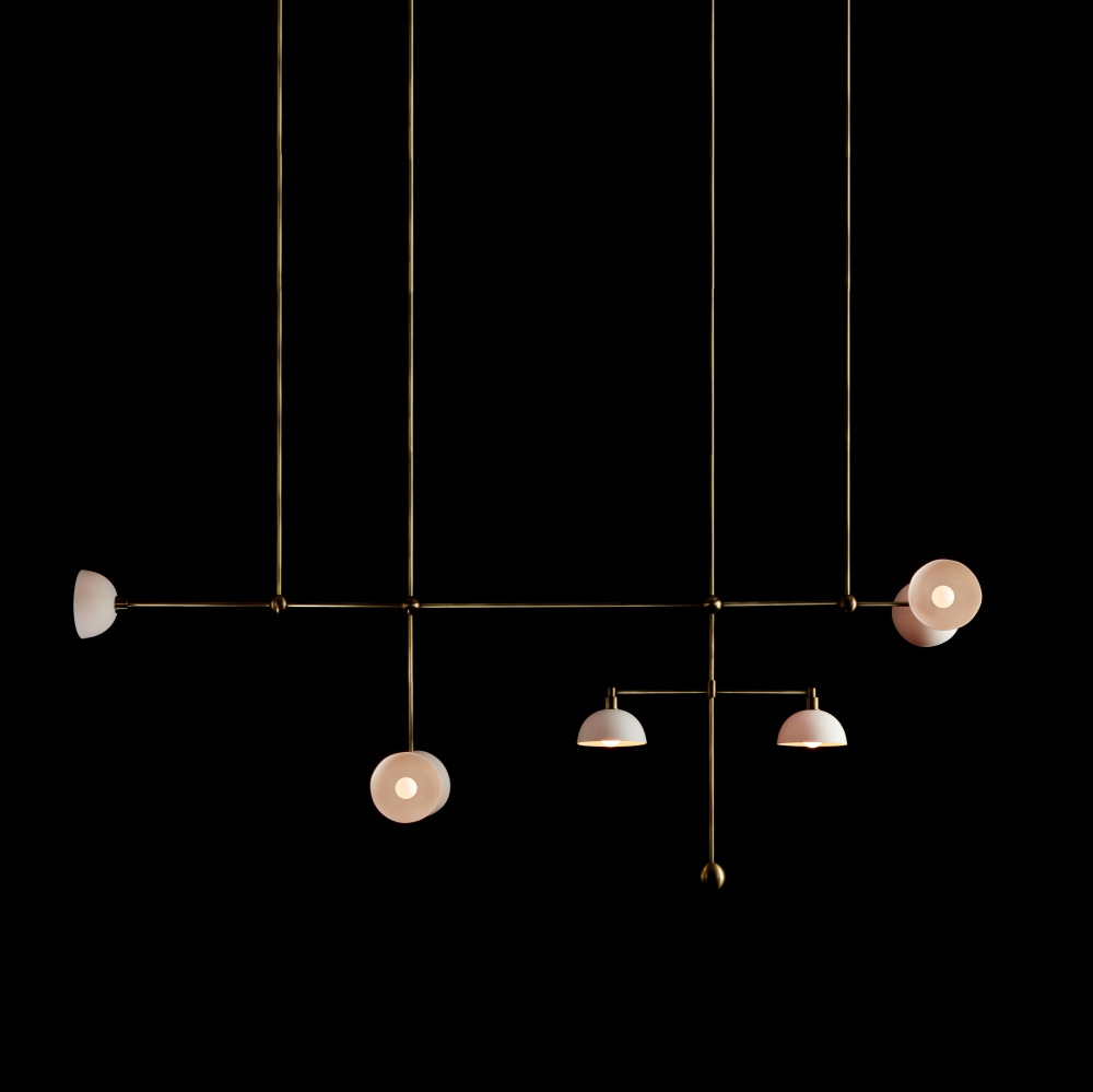 Inspired by the tension and dynamics of the circus act this pendant is a triangle fixed in space. Uninterrupted lines suspend glowing circles from the ceiling creating soft light and graphic appeal. Available with either brass or hand-cast porcelain bowl.