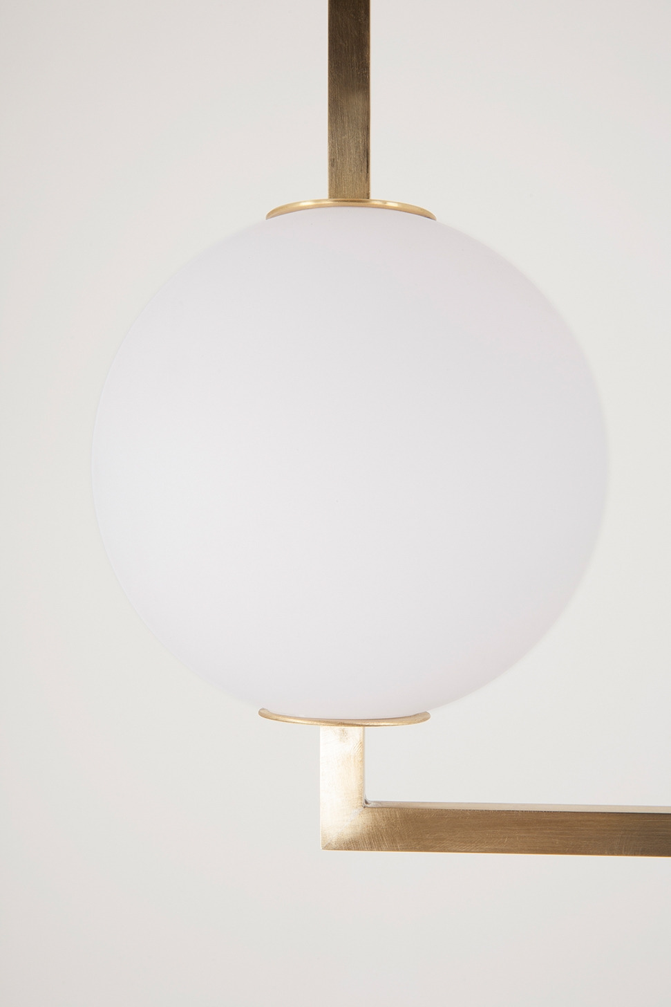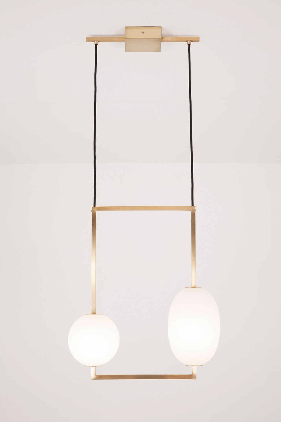 The Miro 2 comprises of two glass shades, one round and one oval, mounted on a single frame of brass square stock. Finish options are pure unfinished brass or blackened brass. The Miro glass shades are hand blown, sand blasted, and oiled. The wire is black cloth covered and can be ordered to a custom length.
