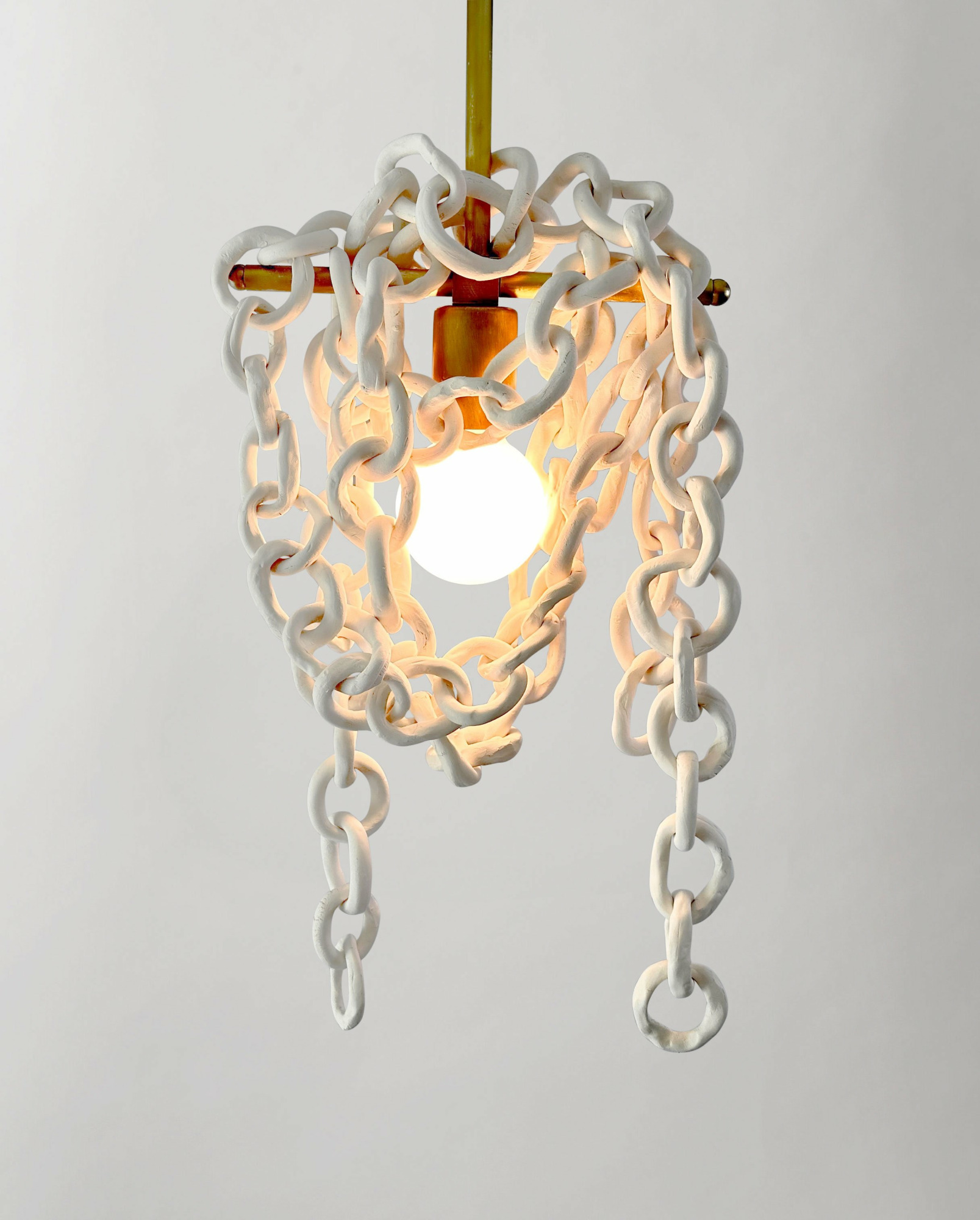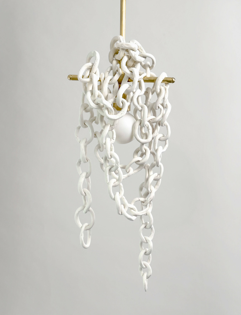 Hanging on a brass cross structure- our new Cross + Chain Light is created with two 36” ceramic chains wrapped around the self-diffusing bulb to give a beautiful inflection of light. The chain can be adjusted to give endless creative looks to this light.