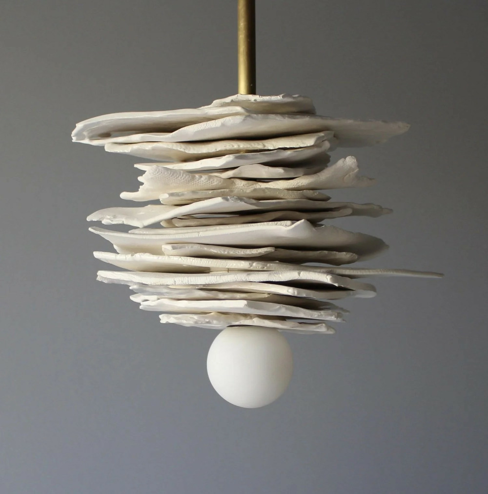 The Stacked Pendant Light is a striking and customizable lighting fixture made by layering ceramic pieces with a mix of finishes. Some pieces have textured surfaces, while others are coated in either a glossy glaze or a velvety white glaze.