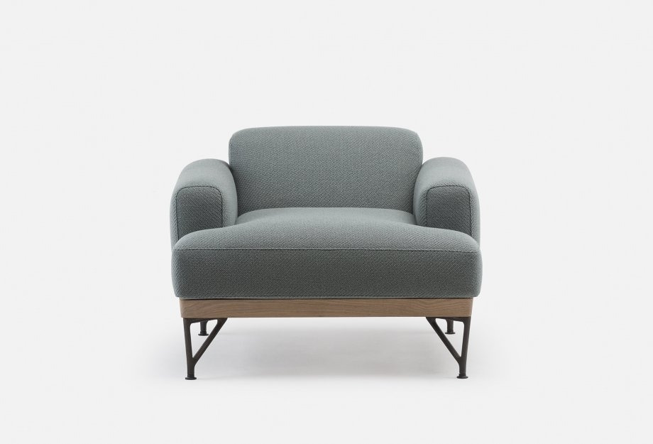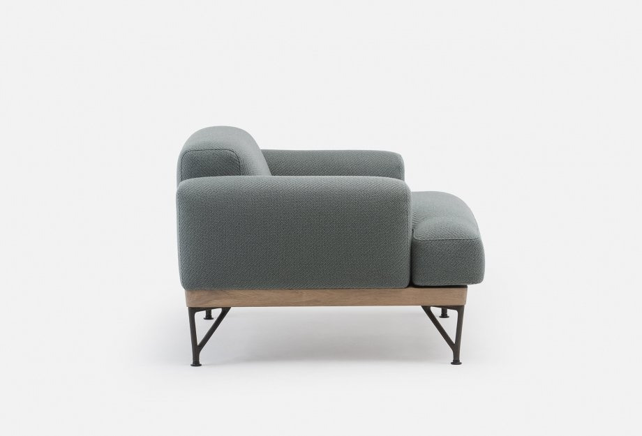 Armstrong armchair is a cool and brooding design with an exposed timber frame and a cast iron legs.
