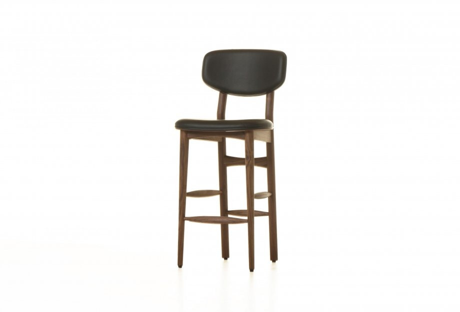 The timber backrest wraps around this elegant upholstered bar stool as the wings of a butterfly.