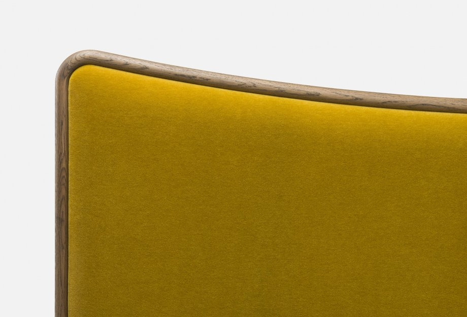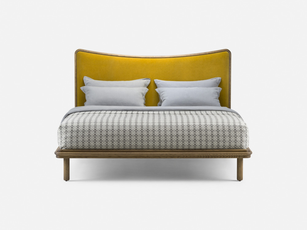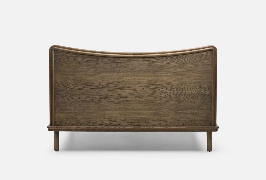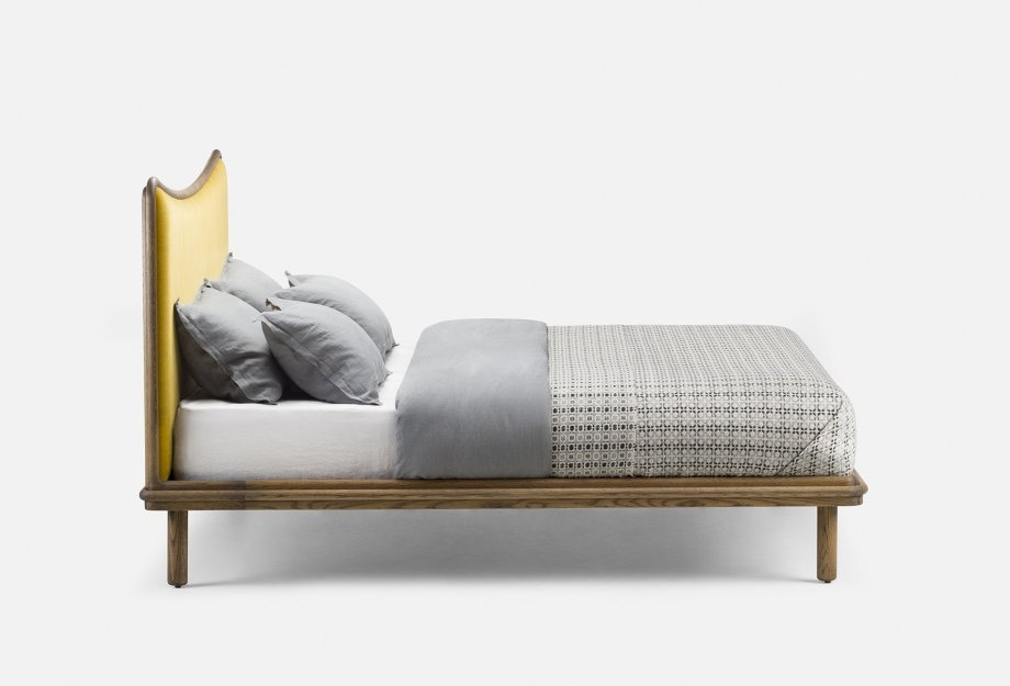 Inspired by the juxtaposition of old and new design seen in converted Brooklyn brownstones, Carlton Bed is modern with historical references. It shares its design language with Elliot Table and Chair. The frame is made from a series of carved wood components, revealing a stunning composition of grain patterns. Upholstery softens the headboard.