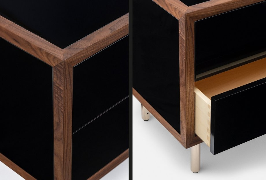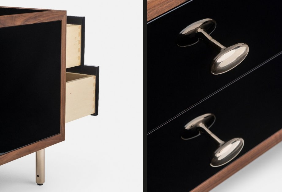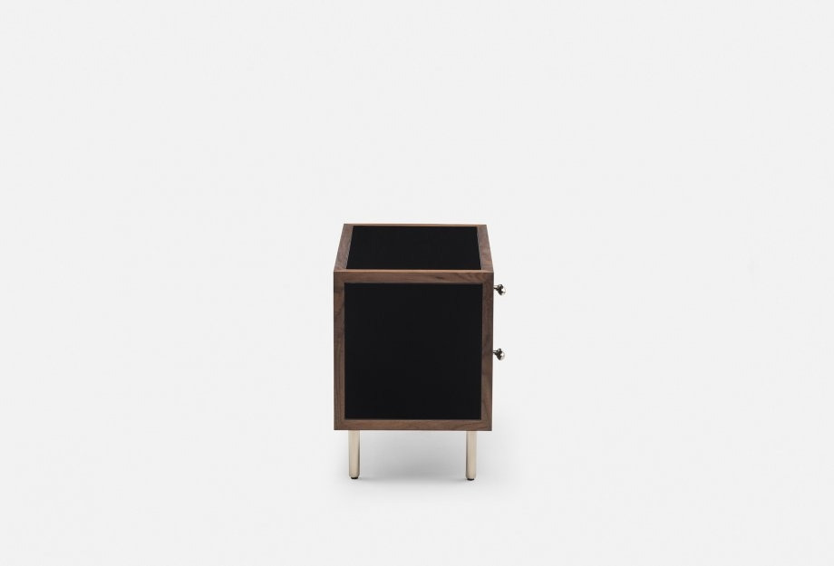 Available in American black walnut, American white oak, or European Ash in a range of finishes; with painted HDF in a choice of our full range of colours with a satin matte or gloss finish. Legs and drawer pulls in polished bronze.