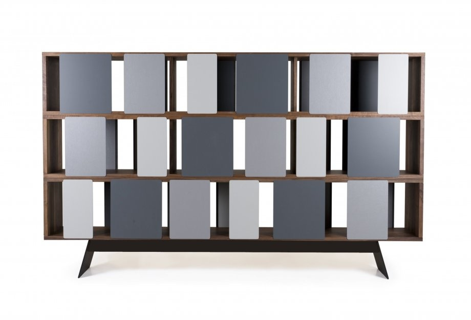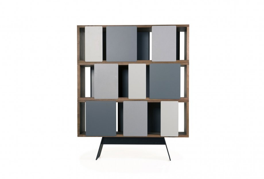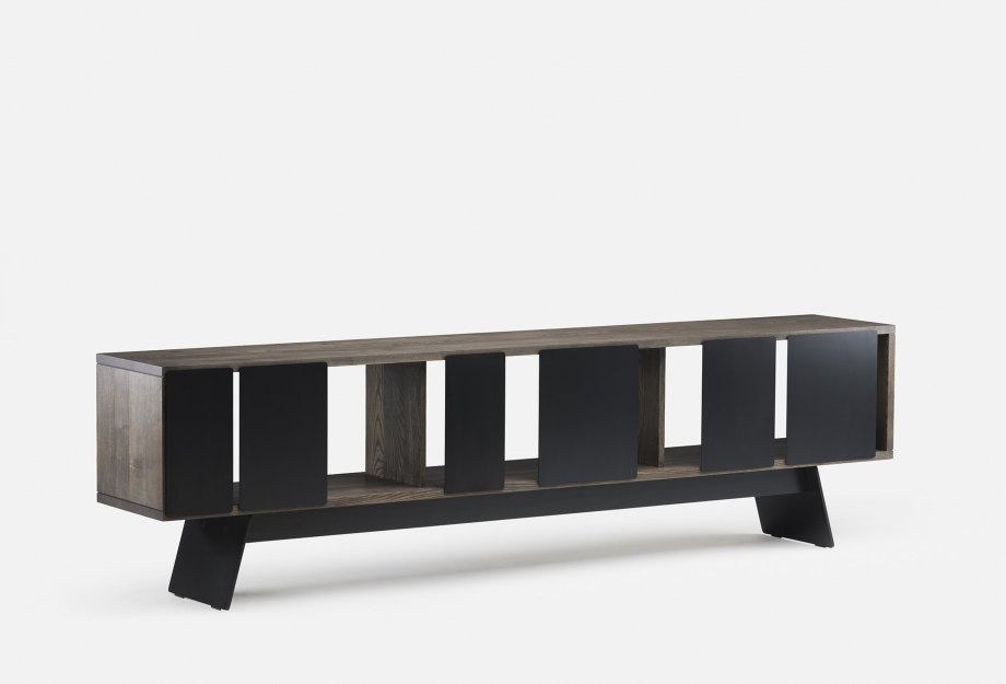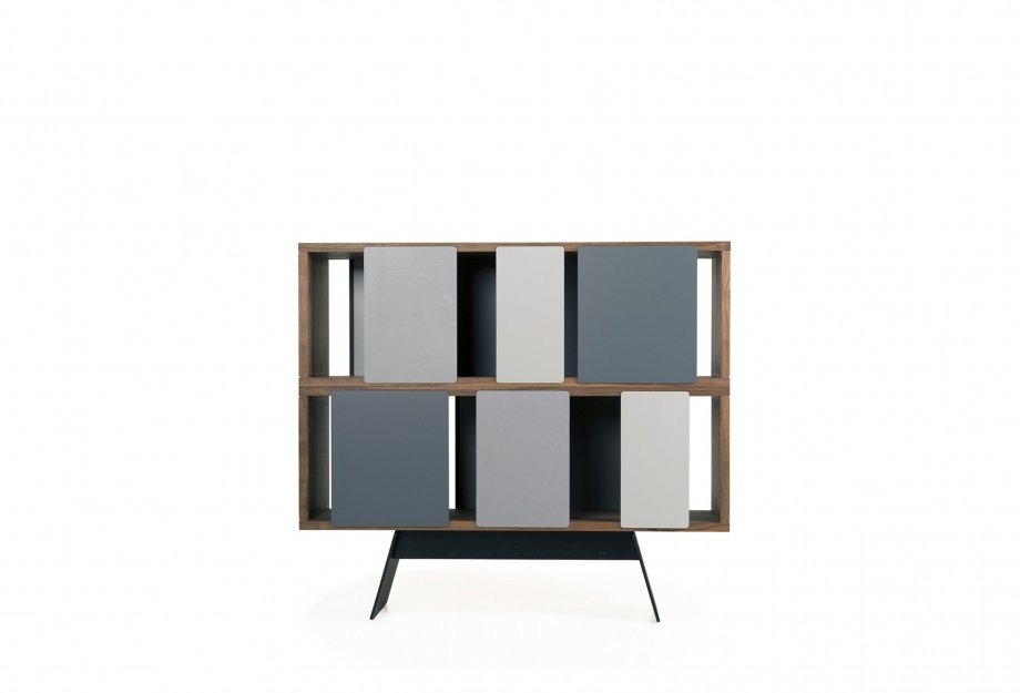 Available in American black walnut, American white oak, or European Ash in a range of finishes. Sliding compact laminate doors articulate the facade. Matte black painted steel legs. The doors are available in black or as a set of three shades of grey.