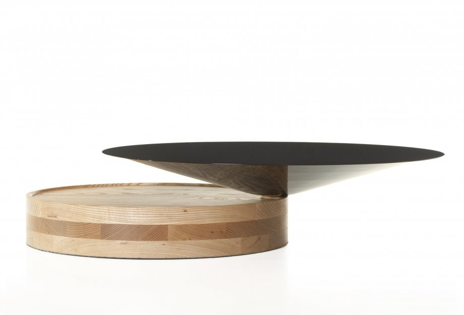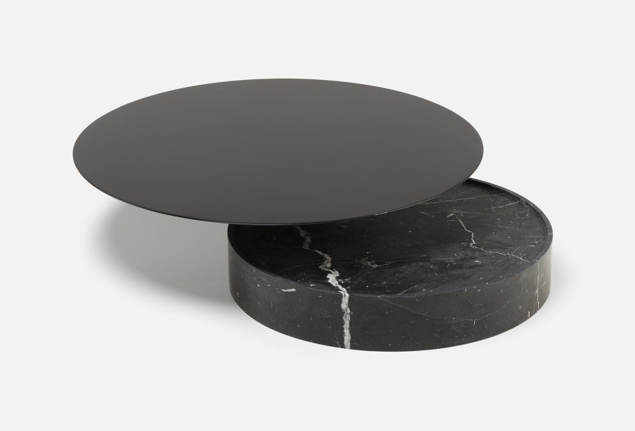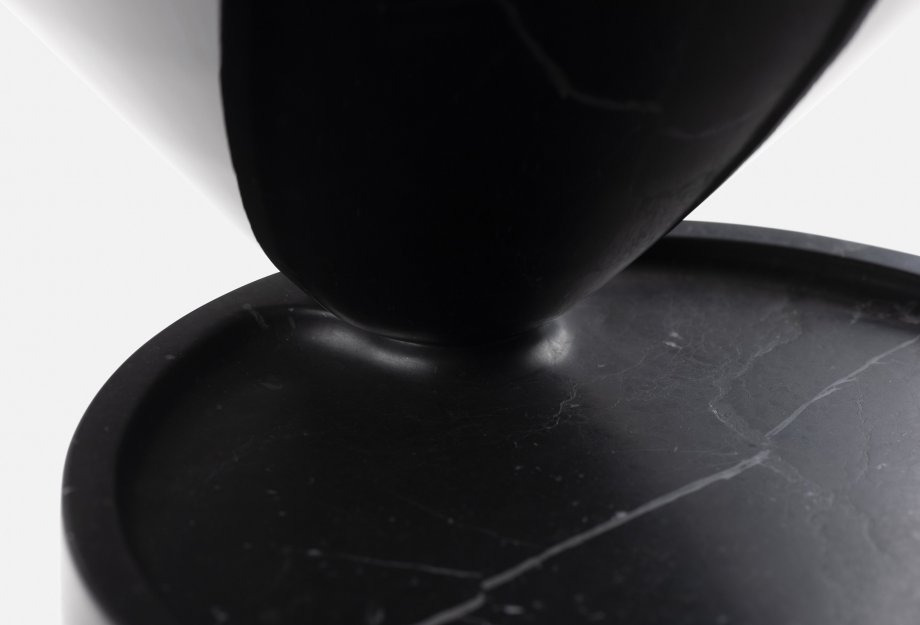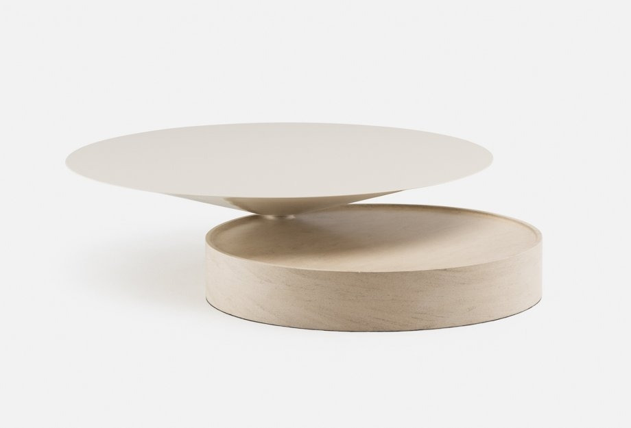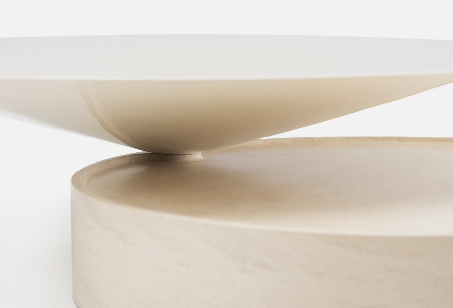 Laurel coffee table is composed of two pure geometric shapes, cone and cylinder, intersecting to create two wide and functional surfaces, distributed at different levels. In keeping with the other elements of the collection, the ratio of the materials used is 50/50, in this case painted hdf for the cone, that appears to balance weightlessly upon the cylindrical marble base. Also available with a timber base.