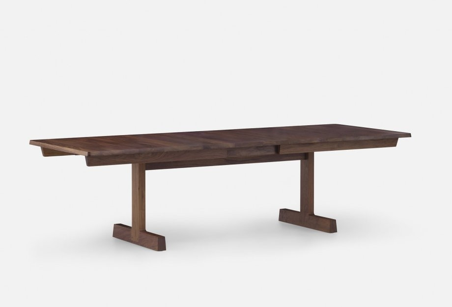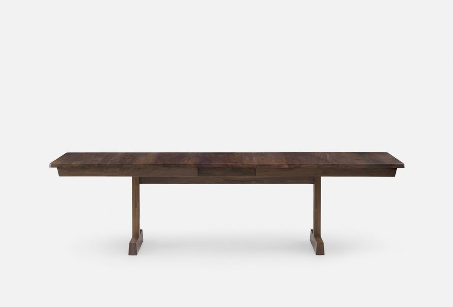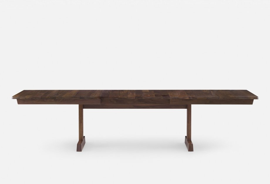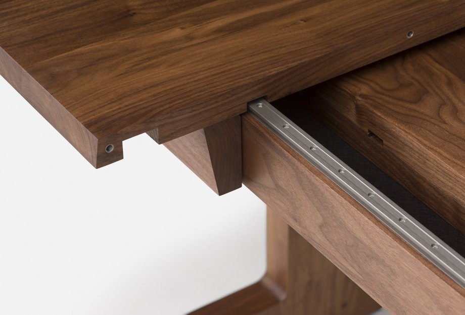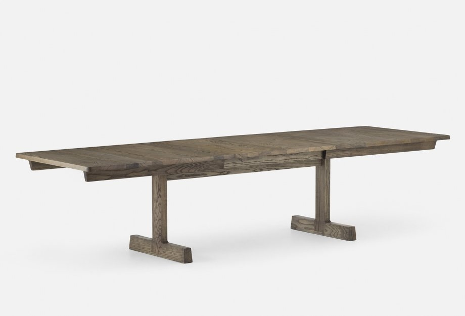 Refectory is a monastic, utilitarian, and robust extending table with a pragmatic, functional design that embraces the passage of time. A very tough yet elegant table in solid timber. Rather than conventional extension mechanisms, the table makes innovative use of linear guides - normally used for accurate and smooth movement of machine components - enabling quiet, maintenance-free operation. The solid wood extension leaves are stored inside the tabletop when not in use.