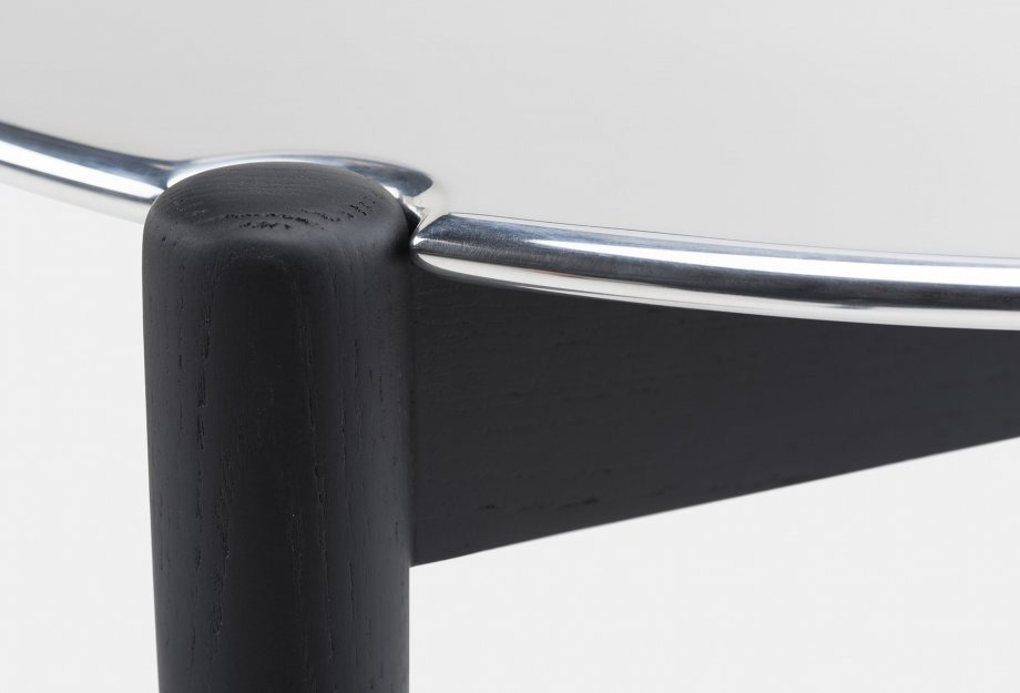 Available in American black walnut, American white oak, or European Ash in a range of finishes. Tabletop available in polished aluminium.