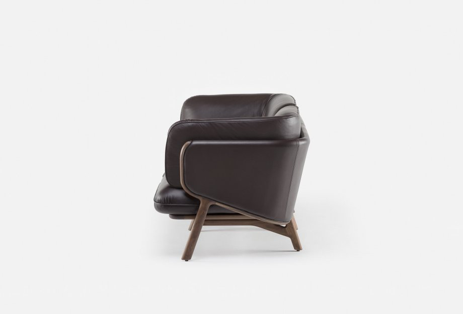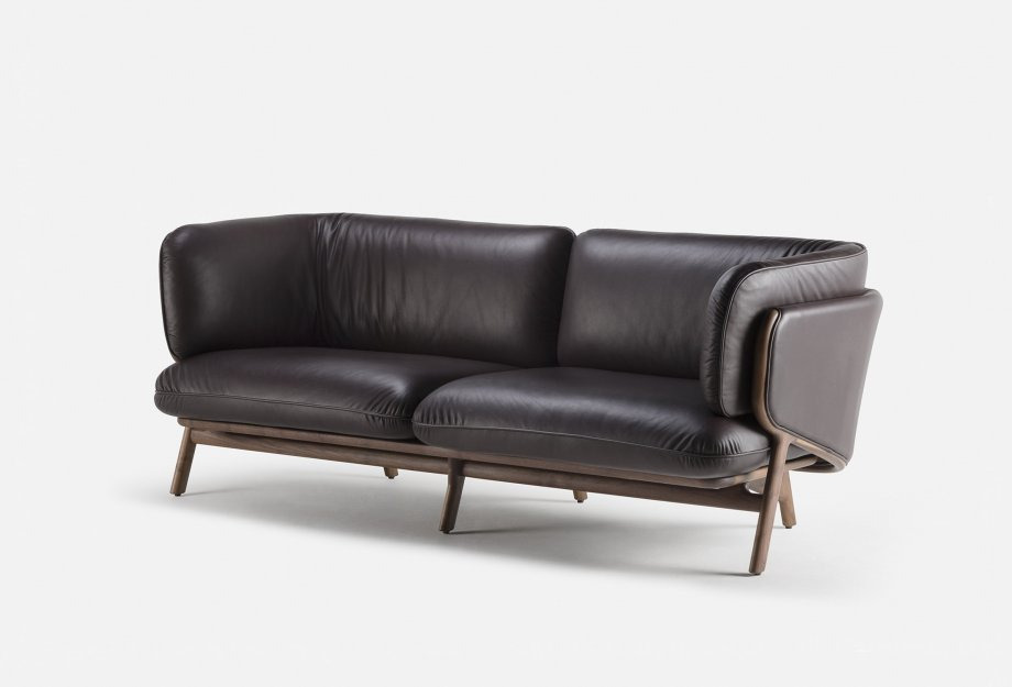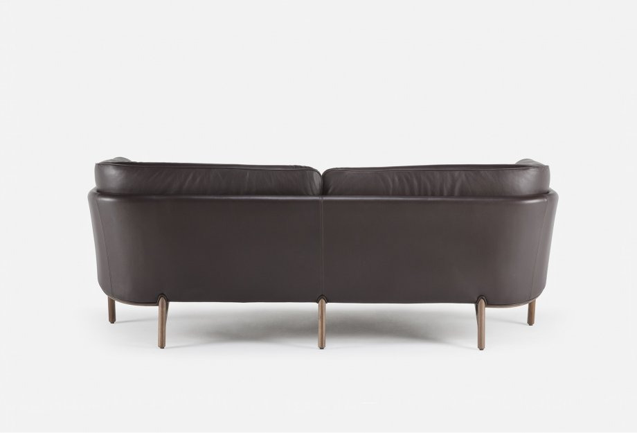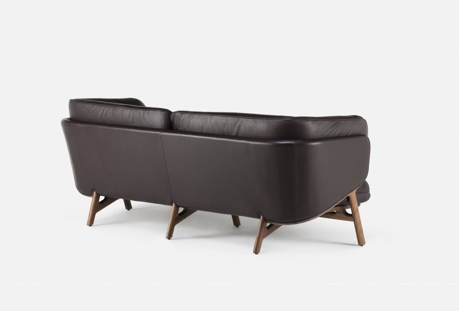 The exposed solid wood frame is the elegant focal point of Stanley sofa, where the expert woodwork is revealed in the details of the joinery. The taut upholstery of the backrest provides a crisp appearance, while the deep back cushions with generously folded upholstery portray the exceptional comfort the sofa offers.