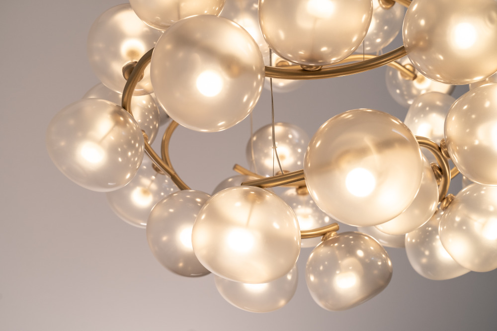Transparent, translucentor blushed handblown borosilicate glass, handmade finish electroplated brass.