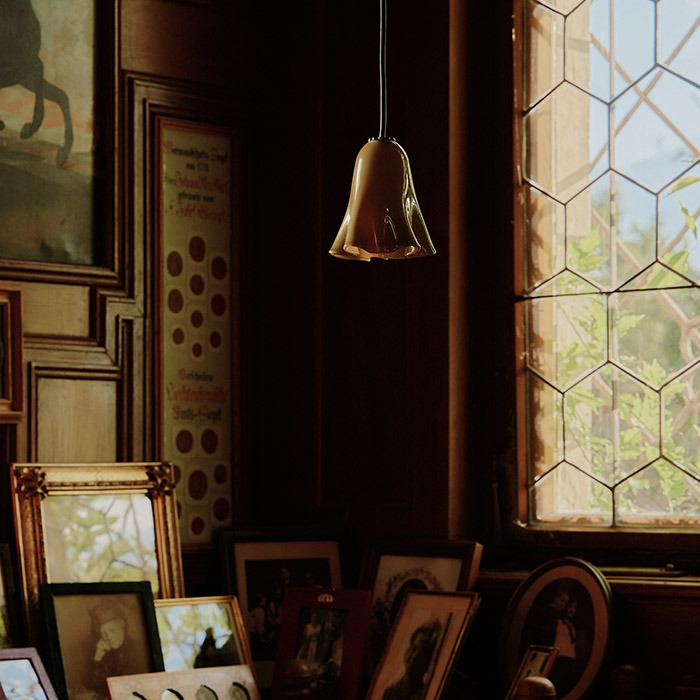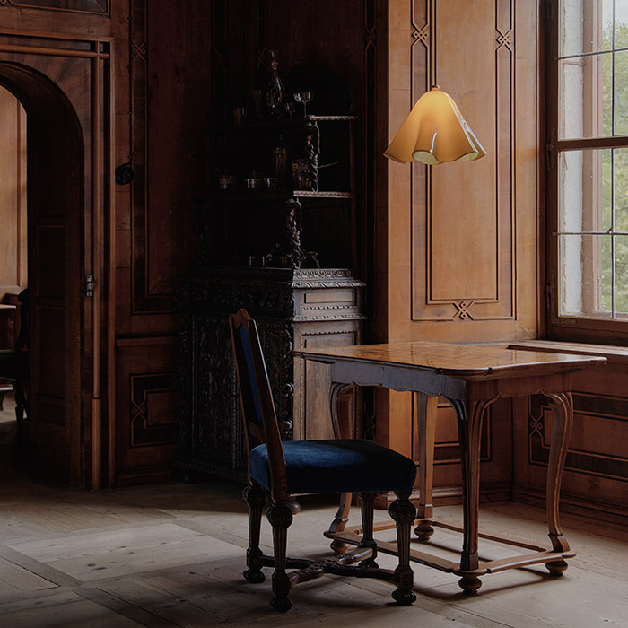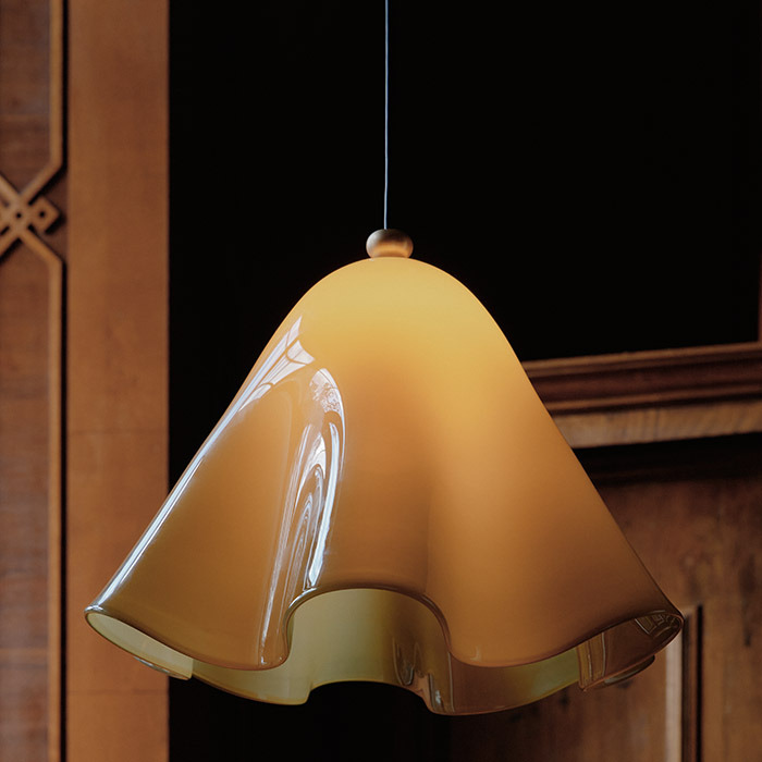 A hand-shaped pendant that’s both elegant and unapologetically bold. Made using the centuries-old fazzoletto technique—in which a molten glass dome is spun upside-down to create waves that resemble the wilting petals of a flower—and fitted with hand-finished brass details. Available with or without handmade dot embellishments.