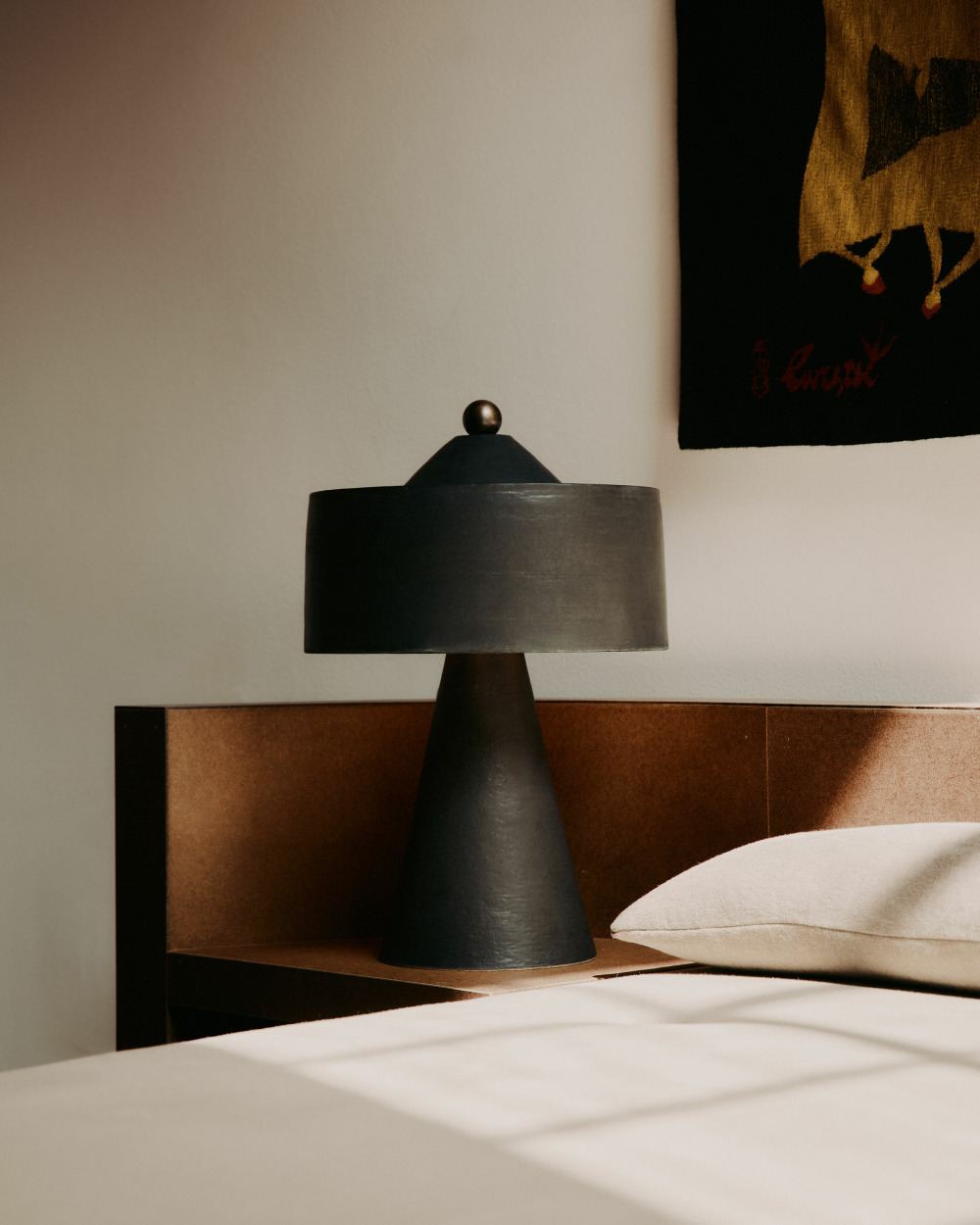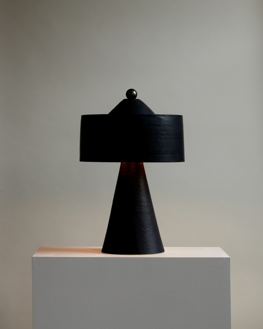 A stately tabletop companion to our larger Helena Floor Lamp. Both pieces combine simple geometric forms with meticulous sculptural handiwork, featuring a totemic, coil-built clay base and an adjoining shade that conceals all hardware and bulbs. Its crowning jewel: A solid brass ball that doubles as a dimmer switch.