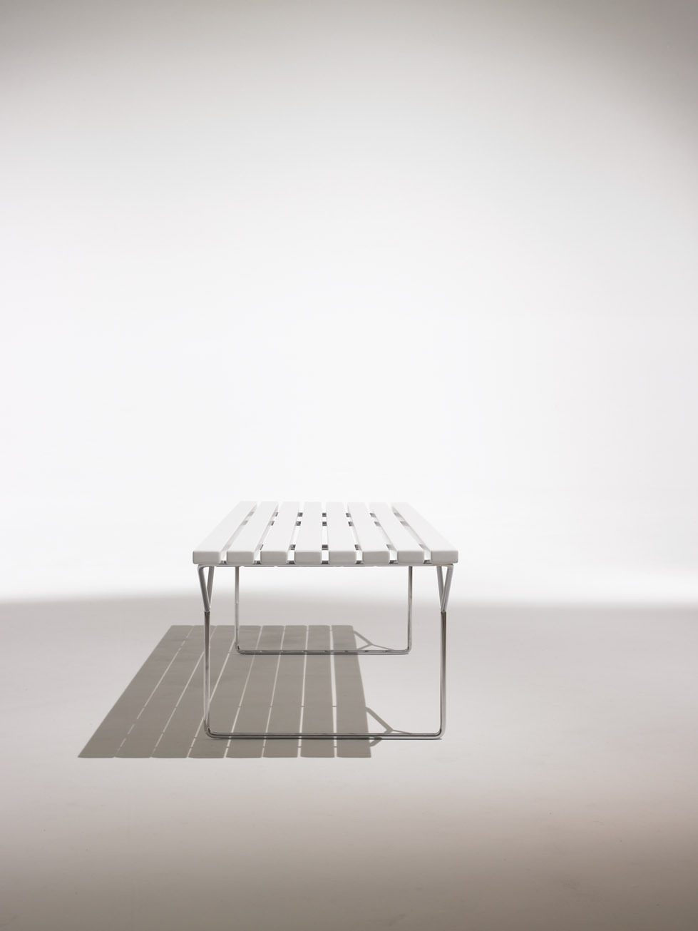 - Bench frame/slat finish combinations: Chrome/black or chrome/white