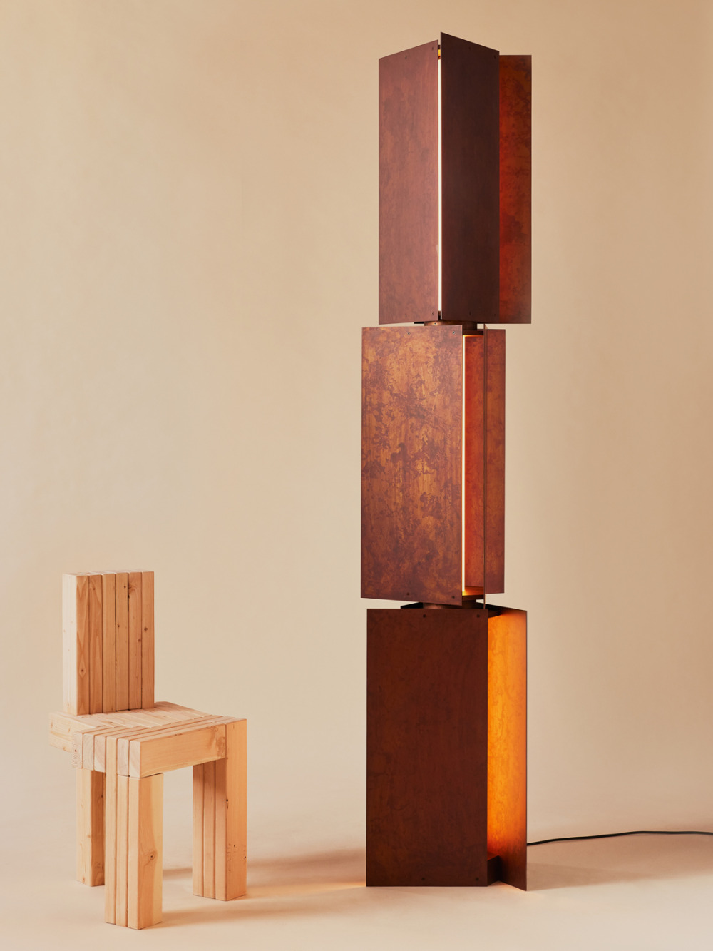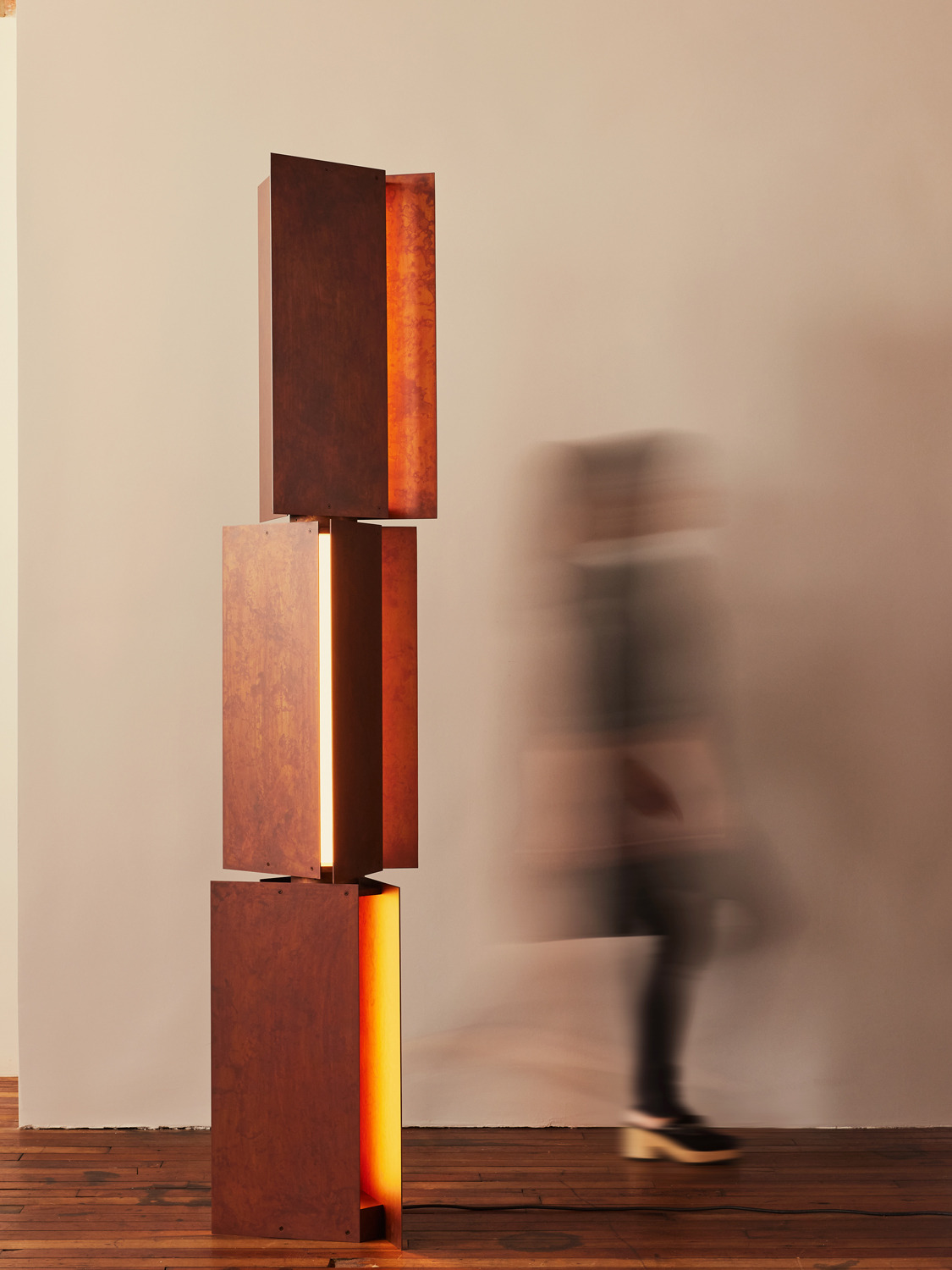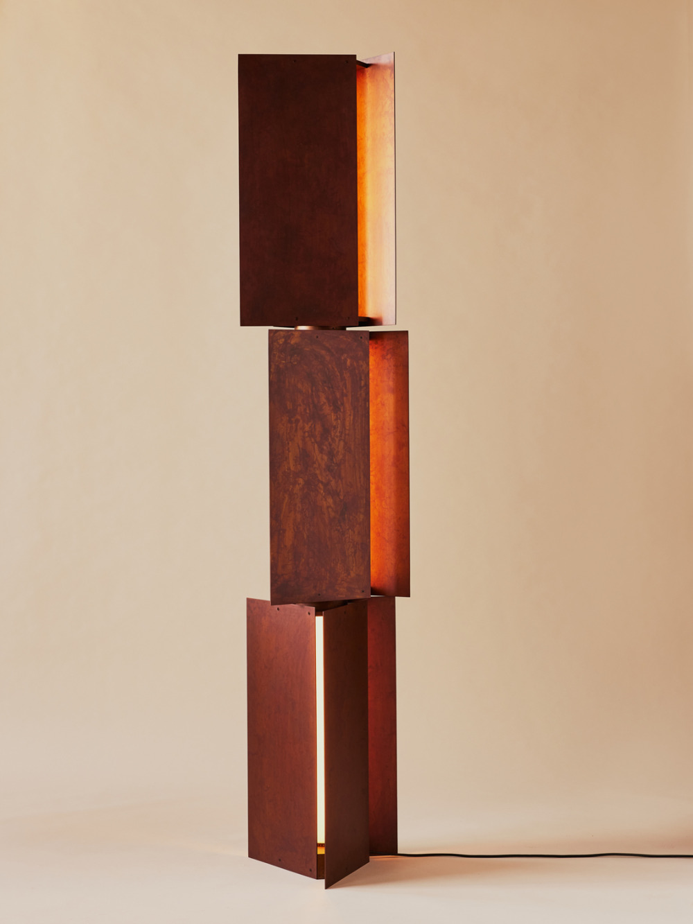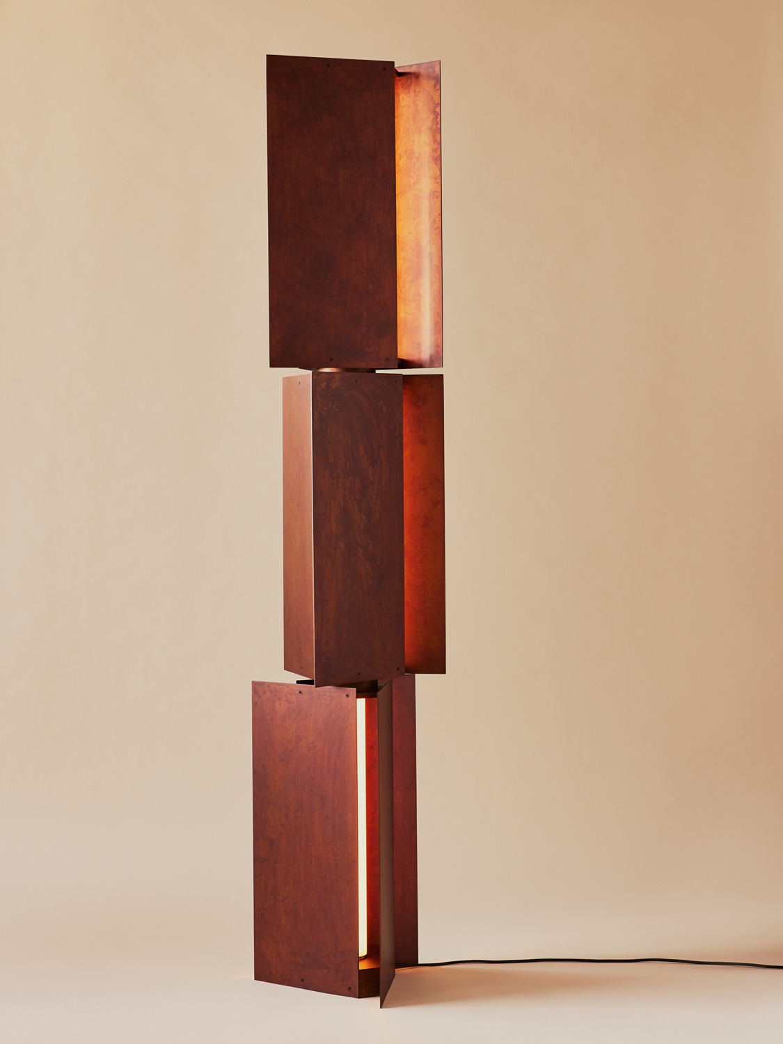 Using the Tripp collection’s distinctive triangular unit as the basis for its pinwheeling form, TRIPP STACK is a patinated steel floor lamp of monumental proportions. The Tripp Stack is part sculpture and part lighting, an illuminated tower that can be placed either indoors or outdoor.  Outdoor installation must be specified when ordered to coordinate structural base plate and power supply. Additional fees might apply.