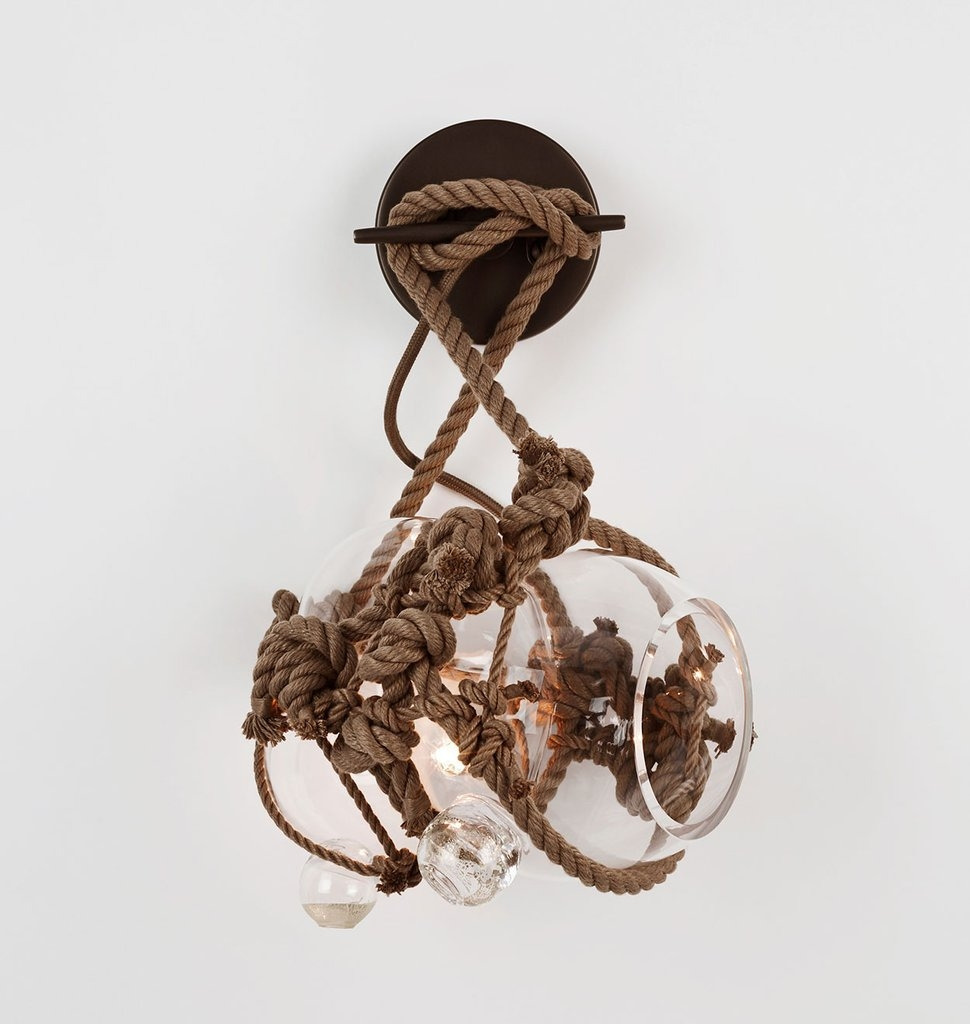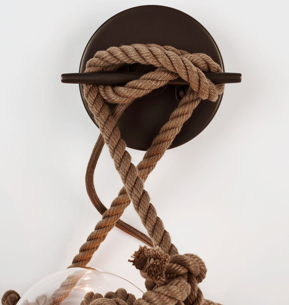 Clear or opal glass with marine hardware and natural or khaki rope. Antique Brass backplate