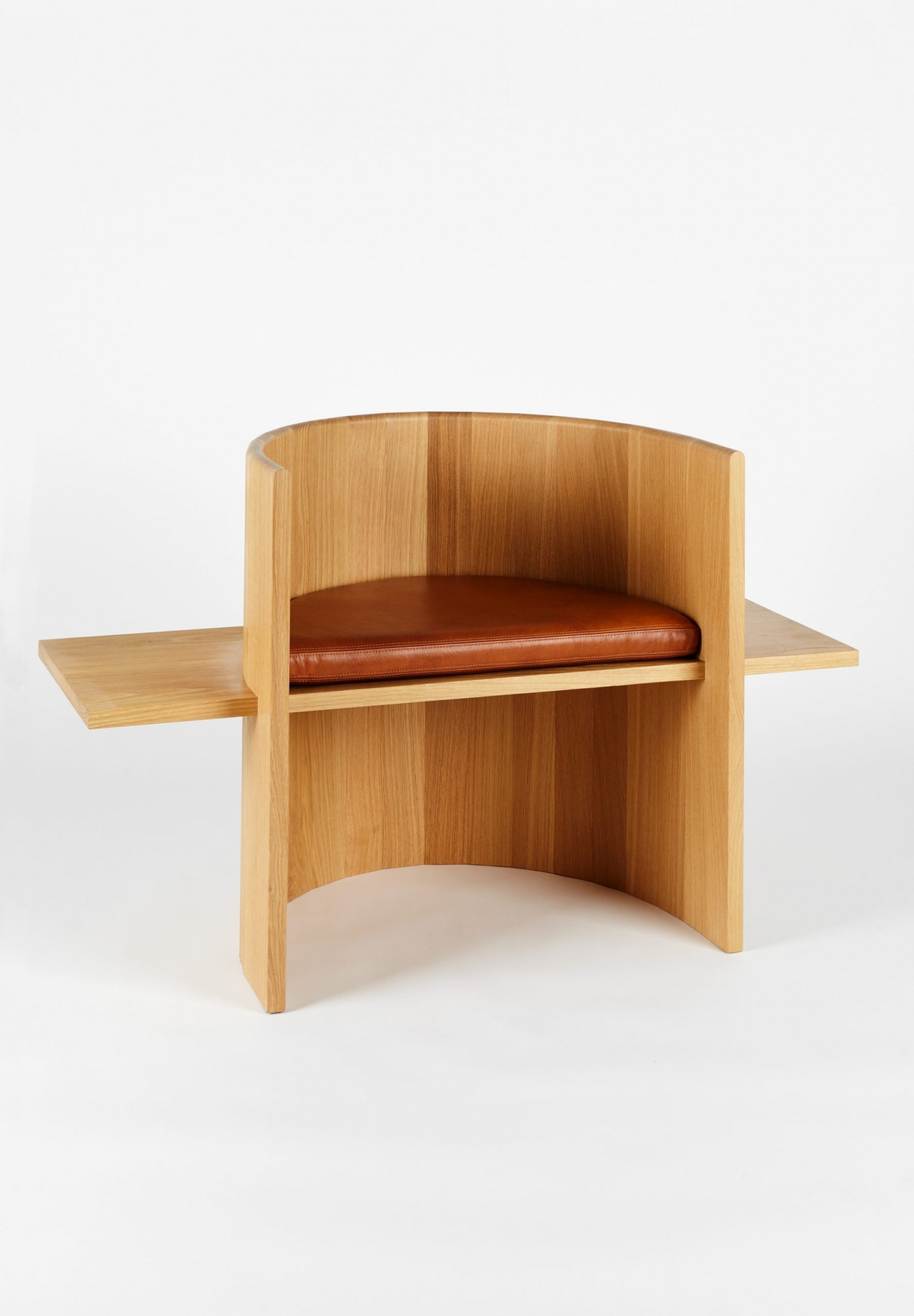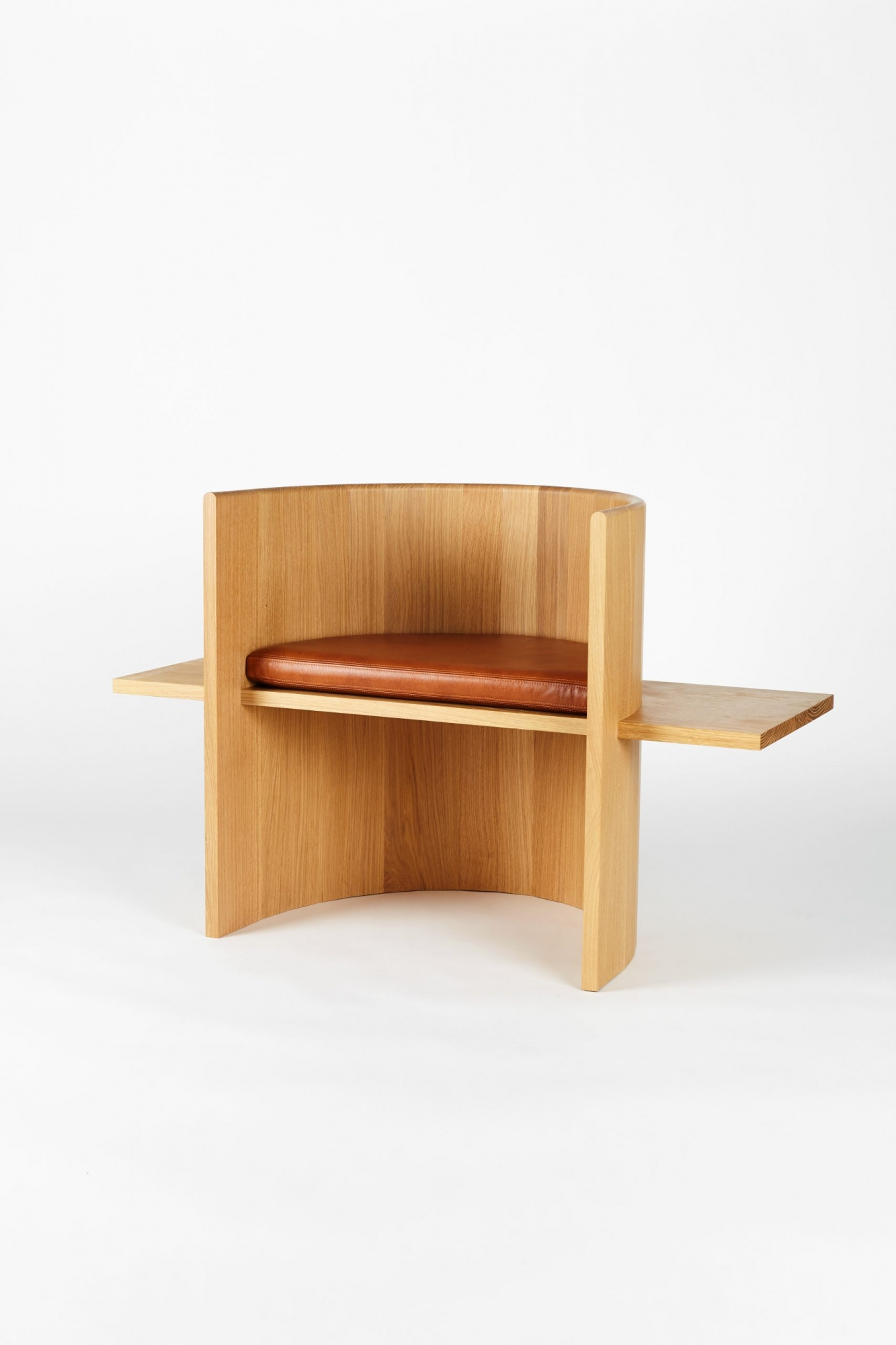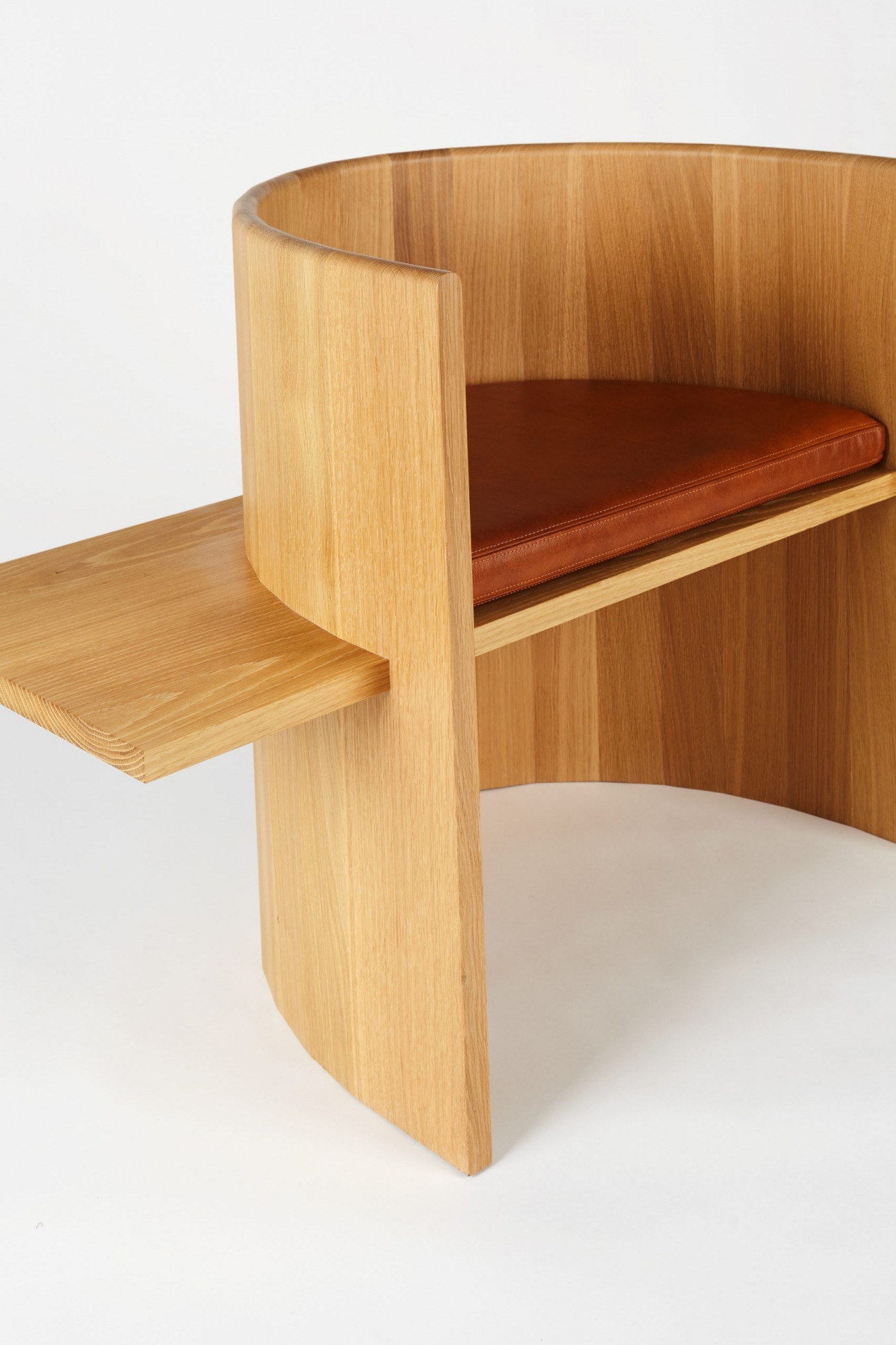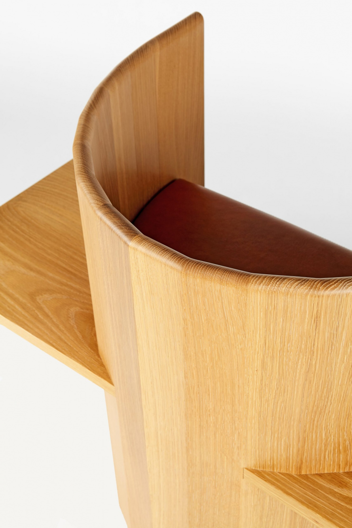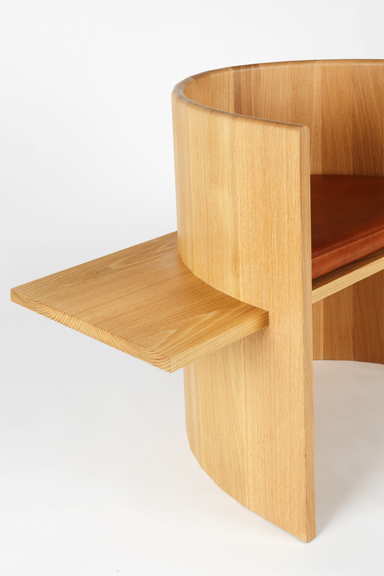 Chair is table. Table is chair. Sit, Set Chair is made entirely of solid wood and without the use of mechanical fasteners, applying ancient folk methods in innovative ways. A coopered, ergonomic arc cradles the back and a horizontal plane fitted with a plush leather cushion supports the sitting body.