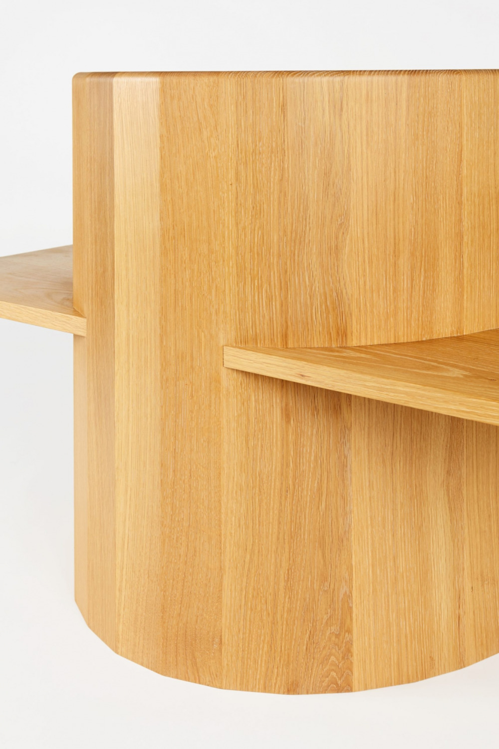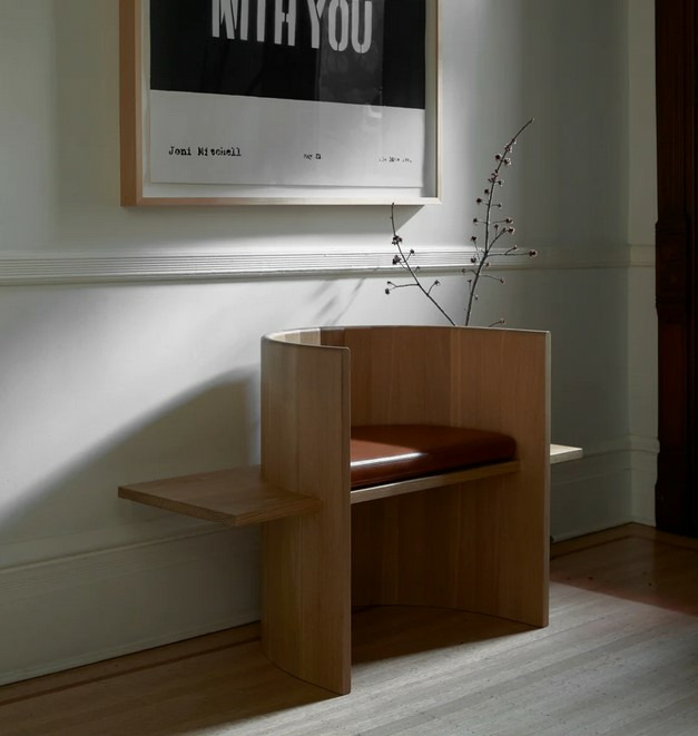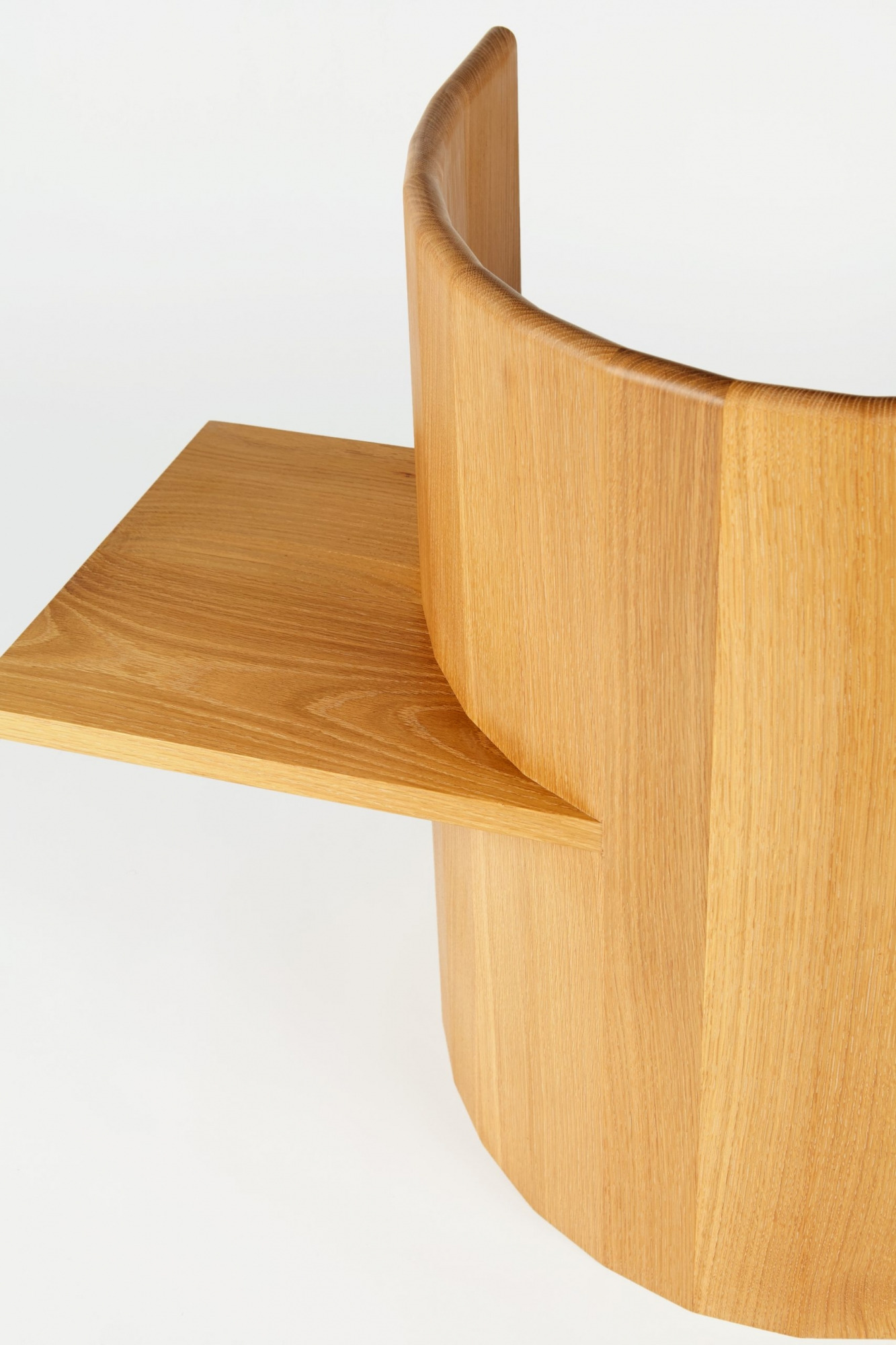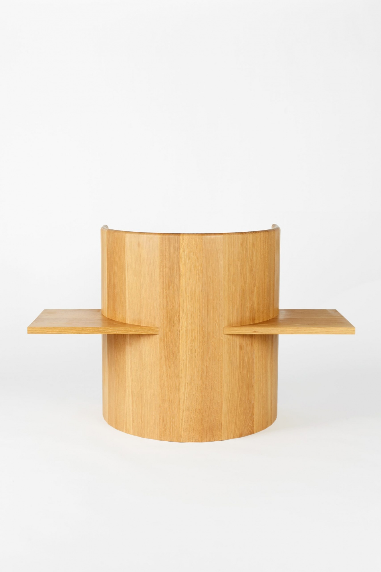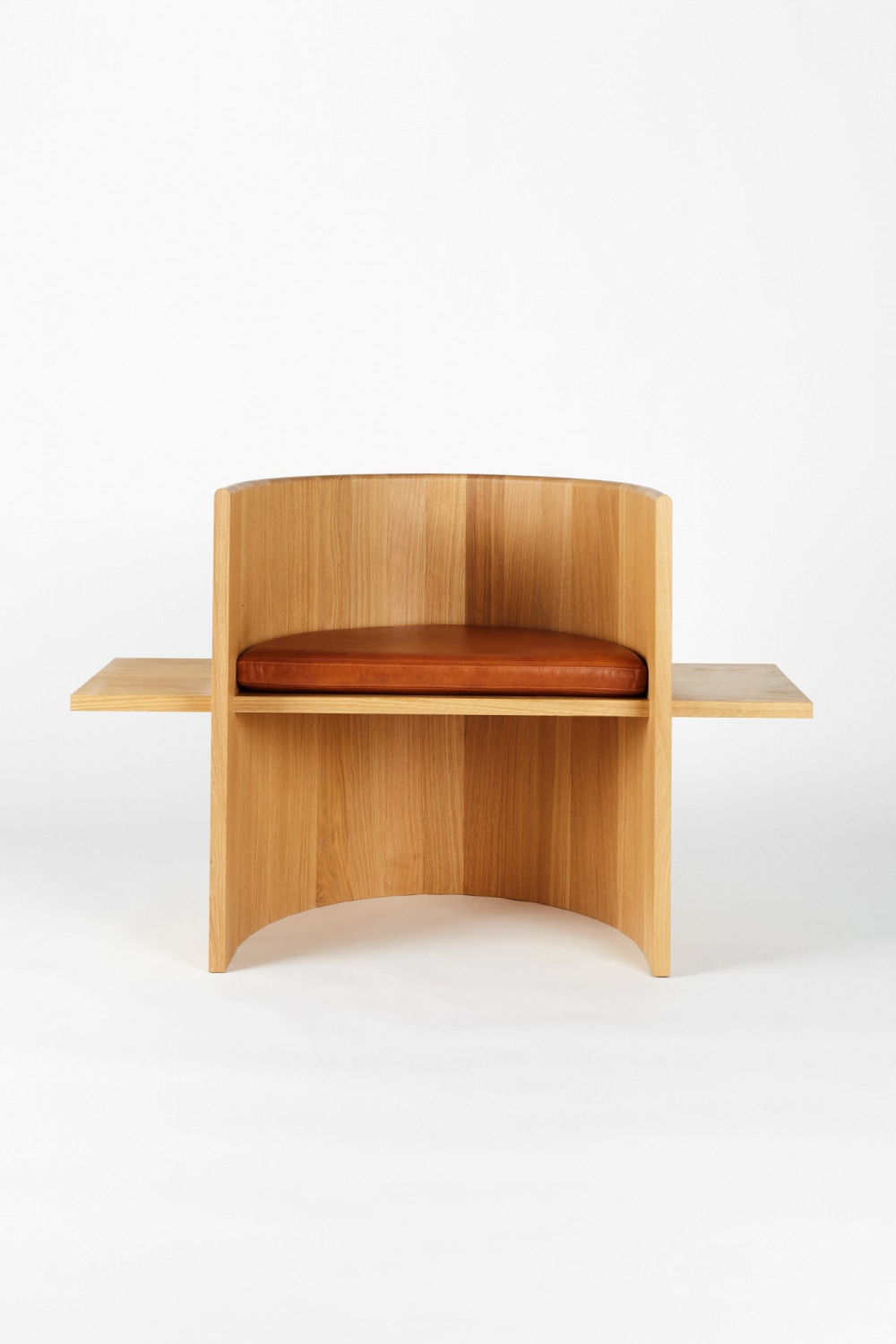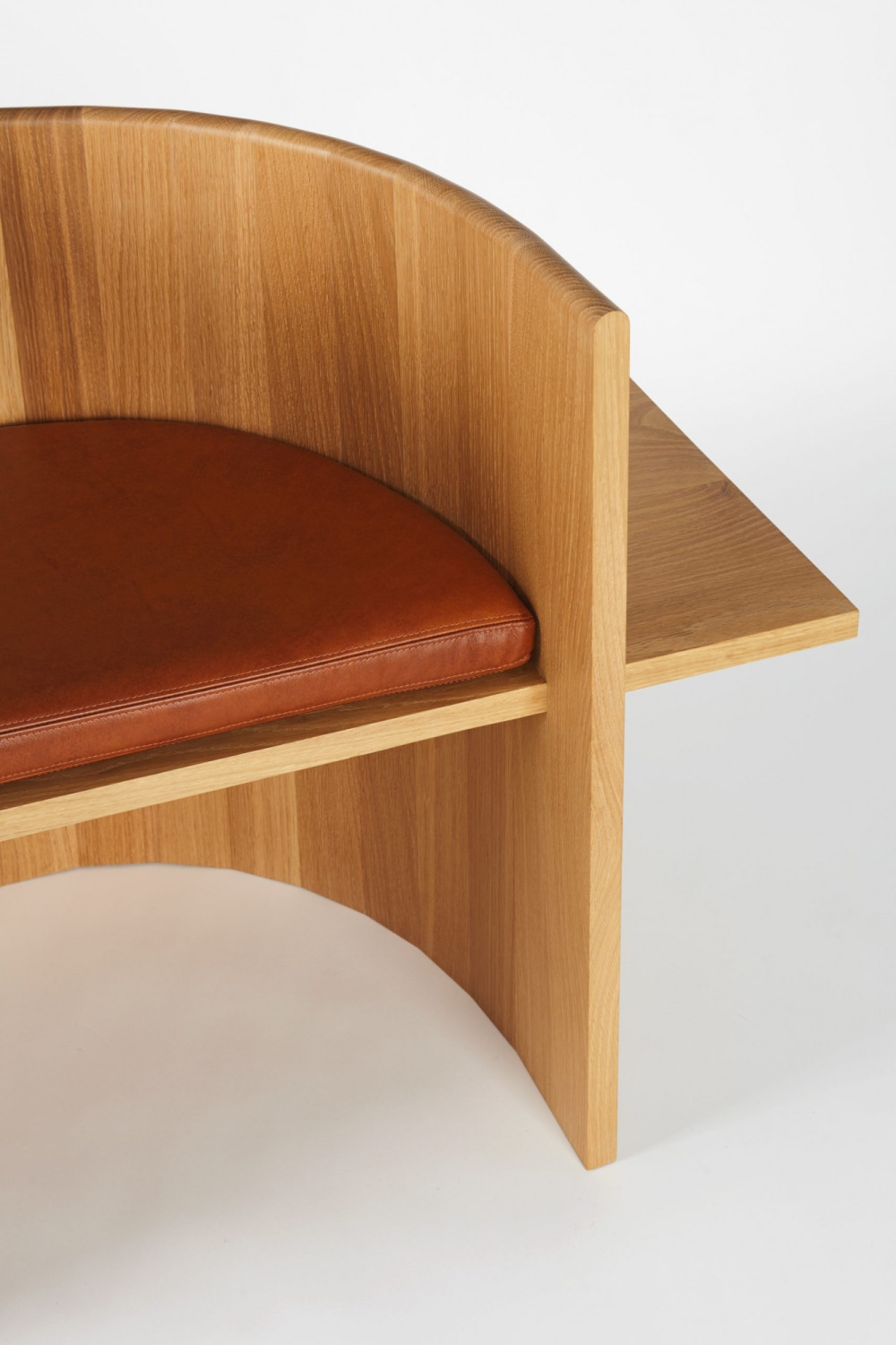 Chair is table. Table is chair. Sit, Set Chair is made entirely of solid wood and without the use of mechanical fasteners, applying ancient folk methods in innovative ways. A coopered, ergonomic arc cradles the back and a horizontal plane fitted with a plush leather cushion supports the sitting body.
