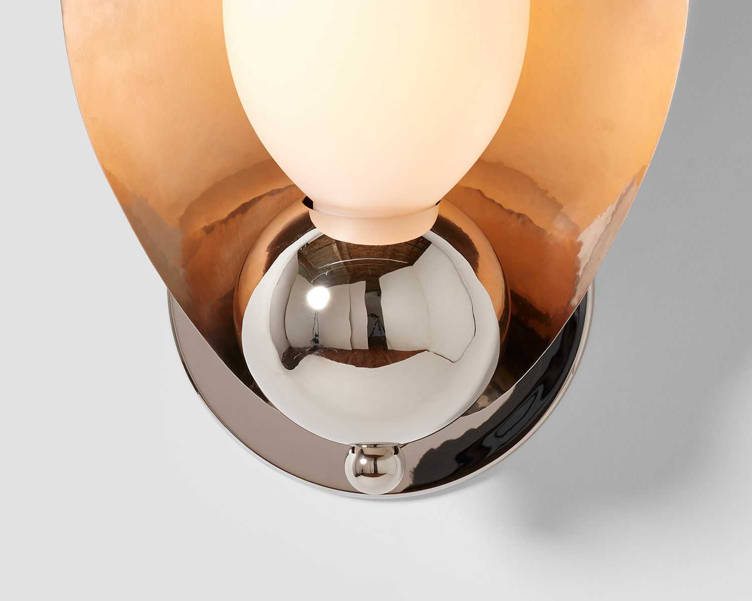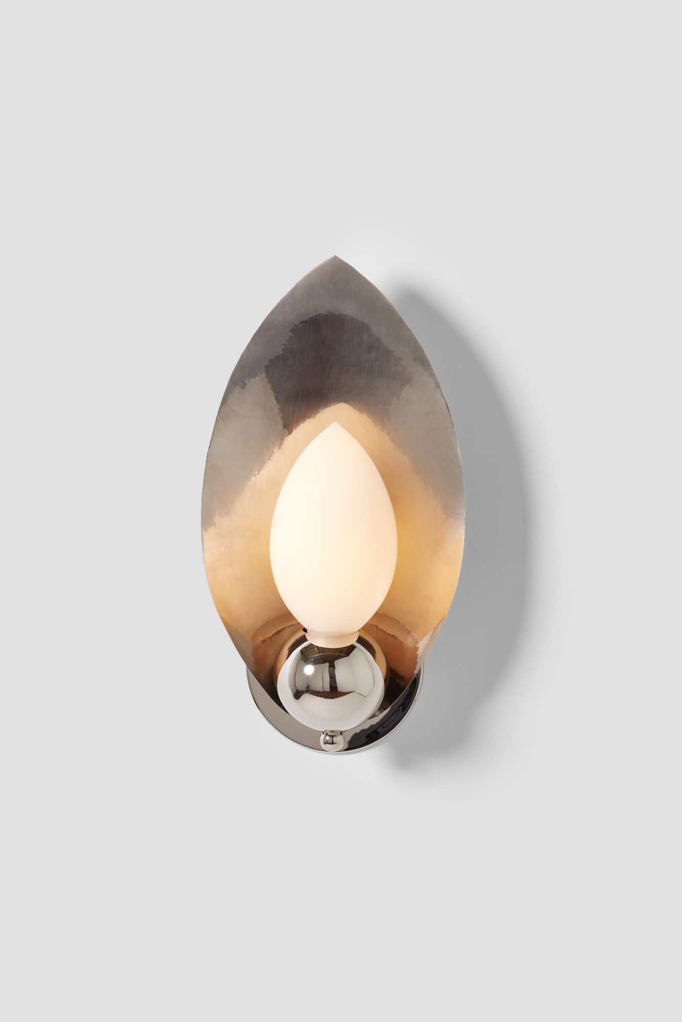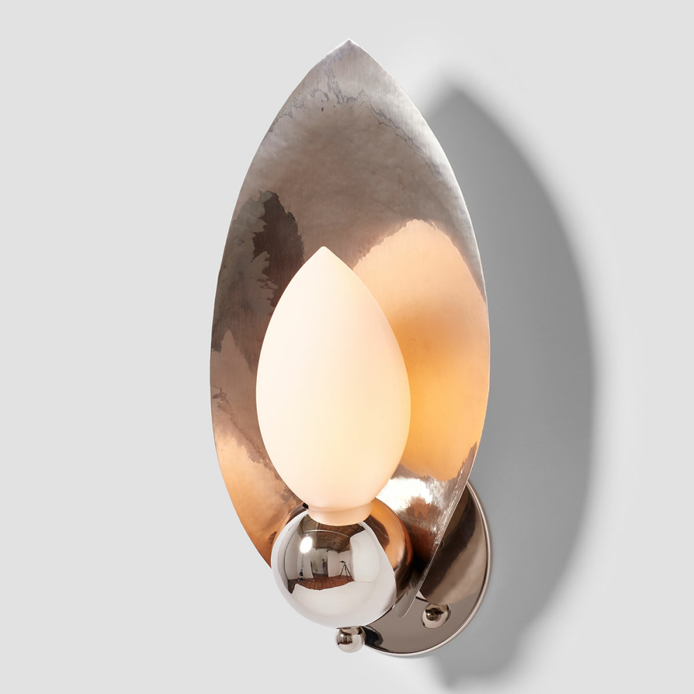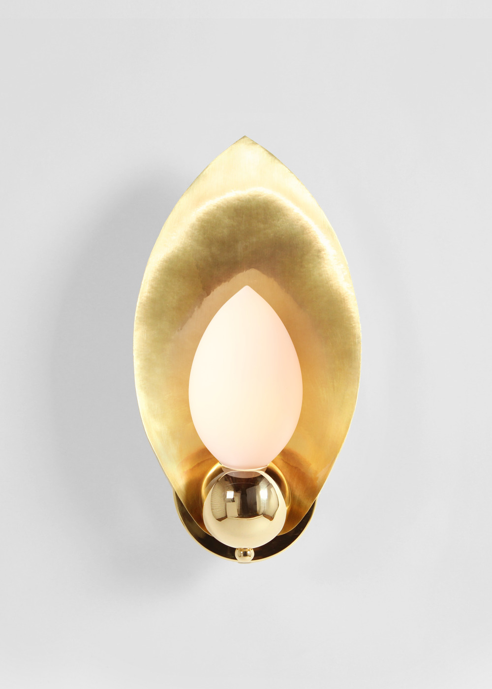 Stemming from ancient Greek jewelry and trips to the Met, Laurel pairs oval leaves with delicate branching frame. Each hammered brass leaf is informed by symmetry and shaped by hand to closely layer around oblong milk glass buds. Laurel leaves follow a gentle spiral twist to convey new growth springing forth.