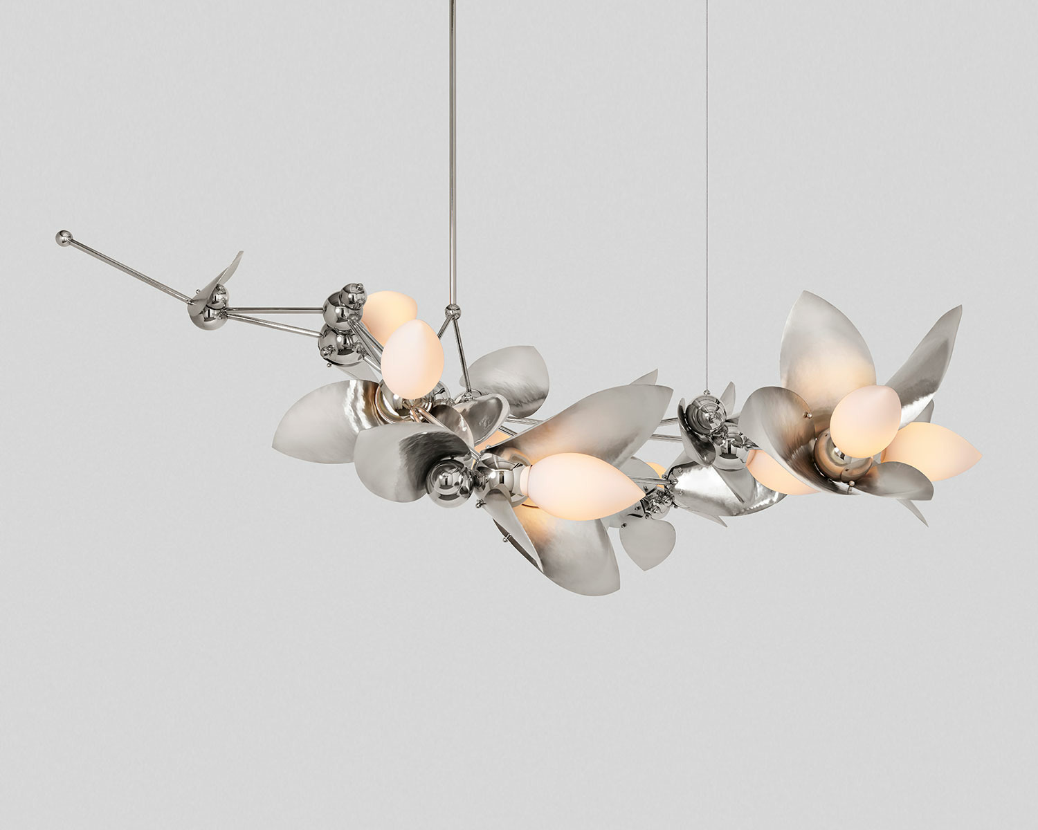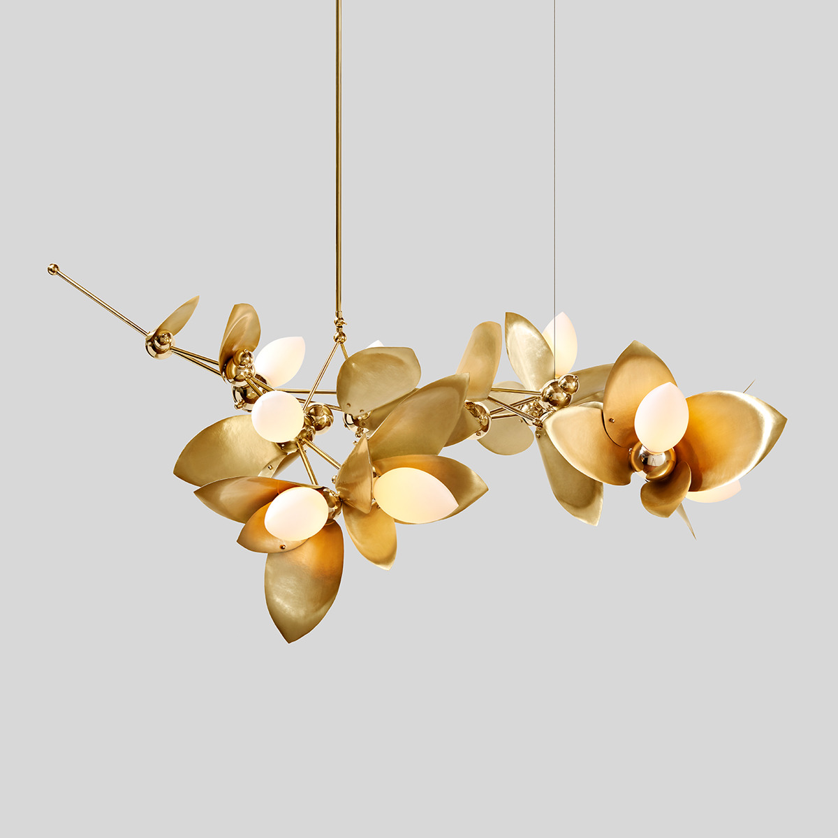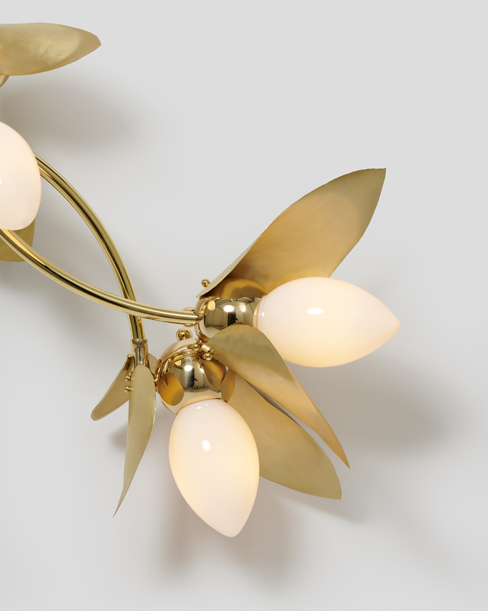 Stemming from ancient Greek jewelry and trips to the Met, Laurel pairs oval leaves with delicate branching frame. Each hammered brass leaf is informed by symmetry and shaped by hand to closely layer around oblong milk glass buds. Laurel leaves follow a gentle spiral twist to convey new growth springing forth.