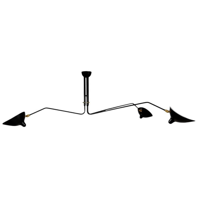 Throughout the 1950s Mouille designed large, angular, insect-like wall mounted and standing lamps with several arms and smaller, more curved wall sconces. He worked to achieve a kinetic, sculptural aesthetic that evoked a sense of movement in space. He claimed his lighting fixtures were “a reaction to the Italian models, which were beginning to invade the market in 1950,” and which he thought to be “too complicated.”