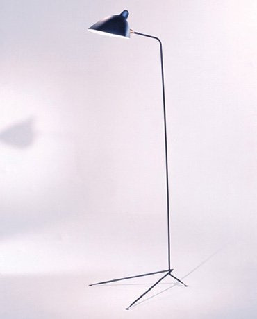 Clean, simple lines describe the elegance of this Serge Mouille floor lamp. A long, slender arm supported by a tapered triangular base allows the swiveling shade to illuminate at any angle.
