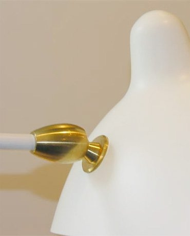 In 1953 Jacques Adnet hired him to design lighting fixtures, an art to which he devoted the rest of his life. Throughout the 1950s Mouille designed large, angular, insect-like wall mounted and standing lamps with several arms and smaller, more curved wall-sconces. Some of his best known designs from the period are his “Oeil” lamp (1953), “Flammes” (1954) and “Saturn” (1958). He worked to achieve a kinetic, sculptural aesthetic that evoked a sense of movement in space. He also claimed his lighting fixtures were “a reaction to the Italian models, which were beginning to invade the market in 1950,” and which he thought to be “too complicated.” His designs from this period were shown mainly at the Steph Simon Gallery in Paris. Towards the end of the 1950s the invention of neon tubes inspired Mouille to create a series of floor lamps that combined incandescence and fluorescence. These designs, called the “Colonnes” collection, had their debut at the 1962 Salon for interior design, and are some of his better known later works.