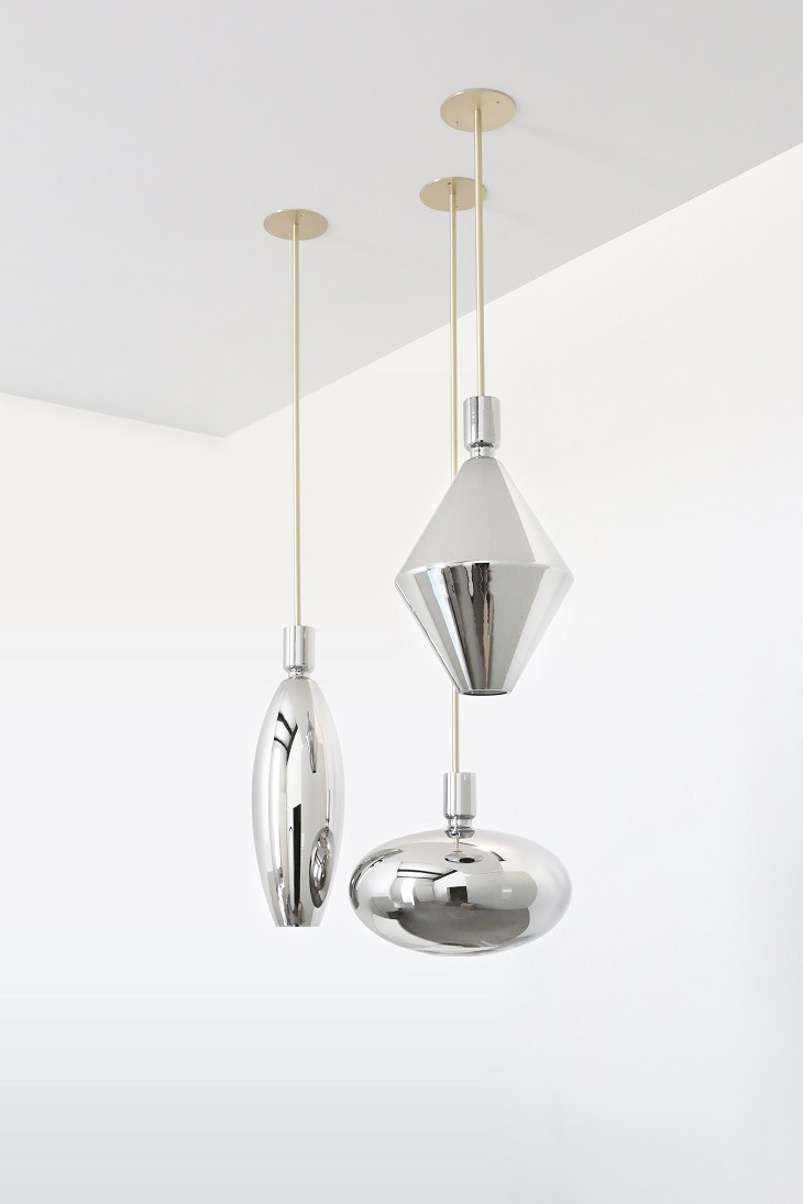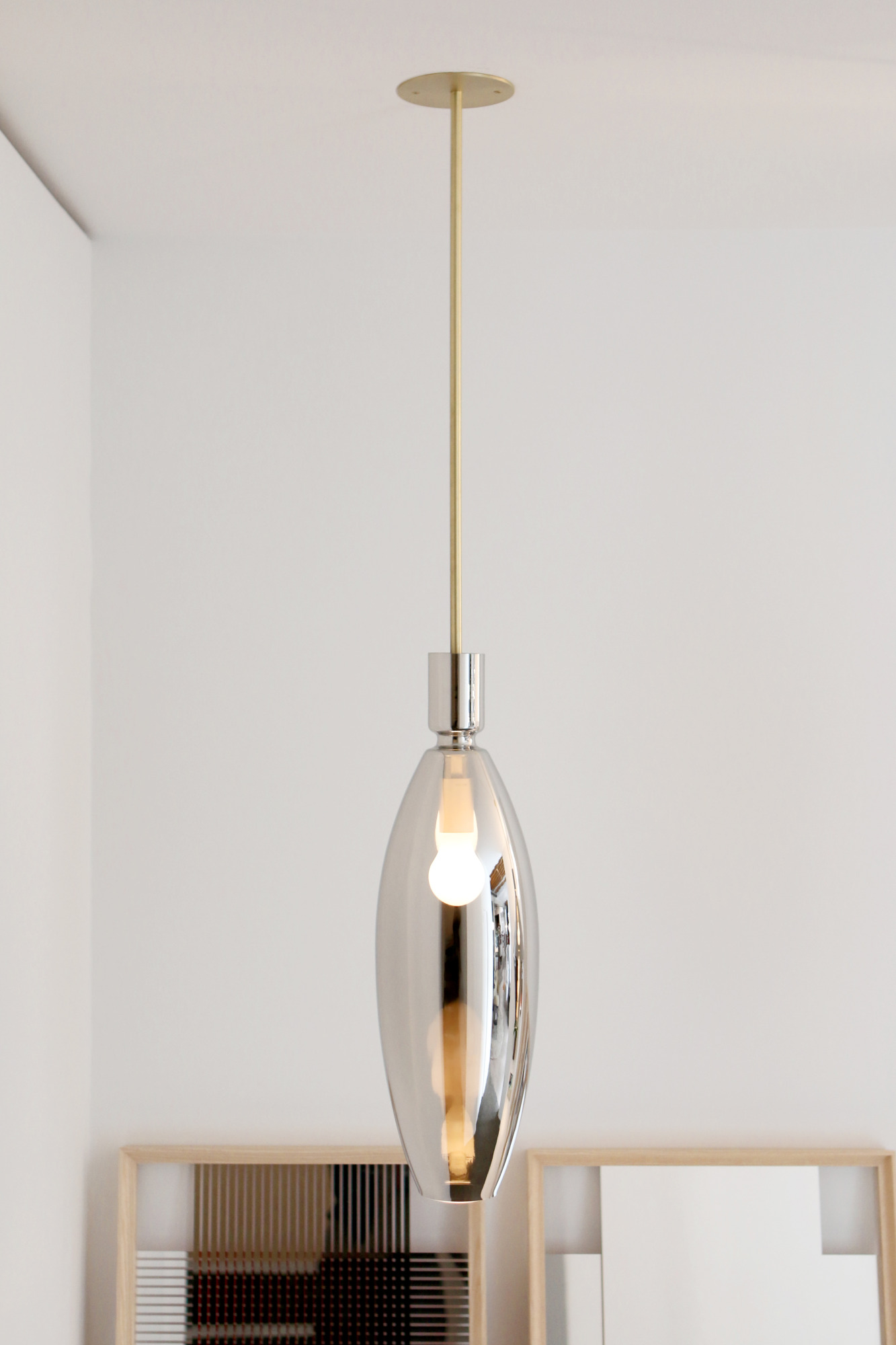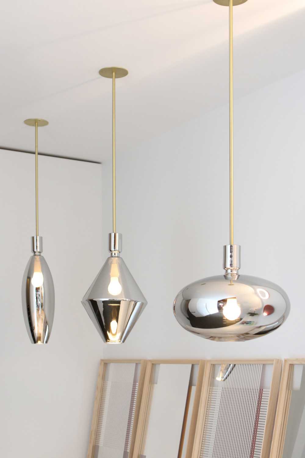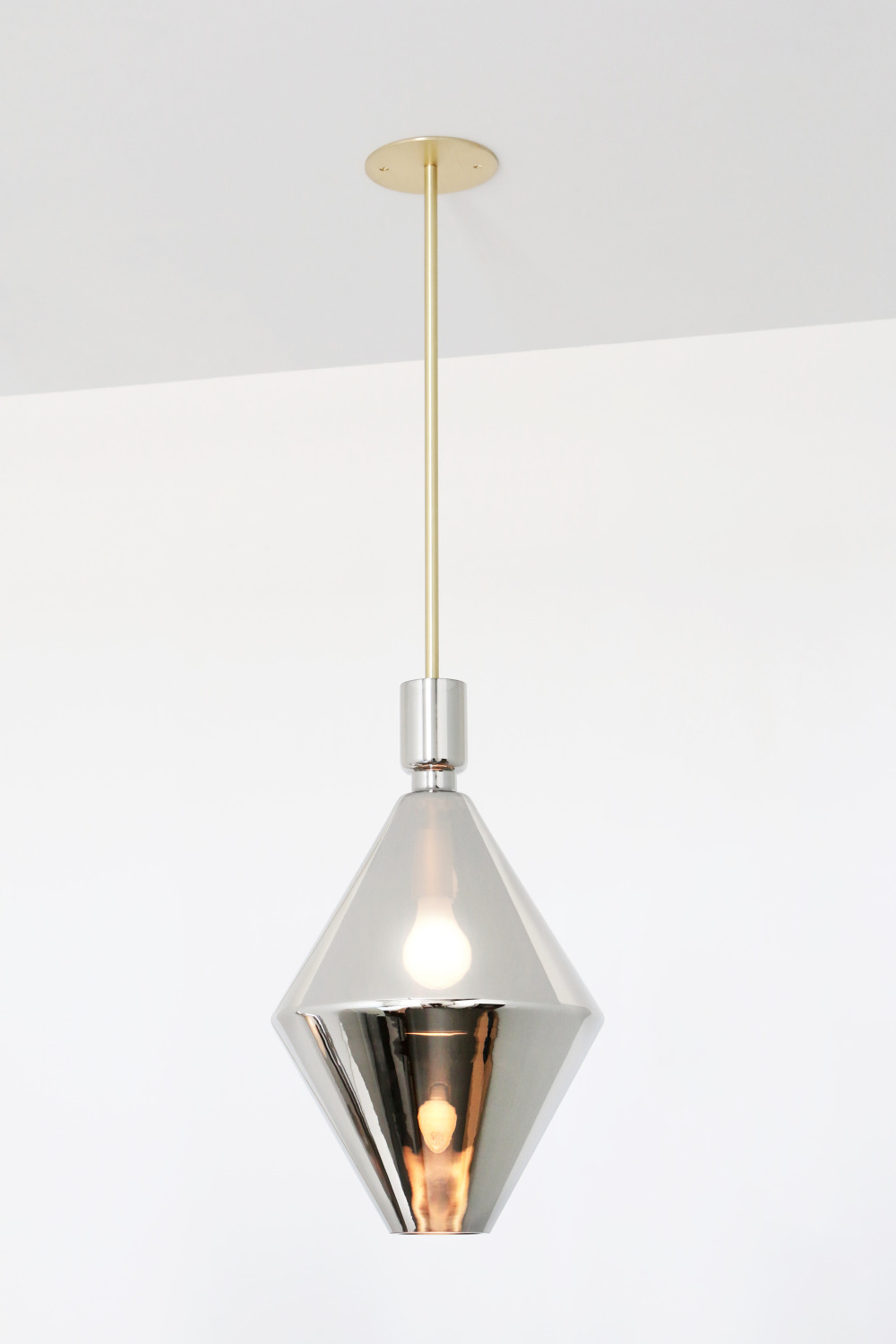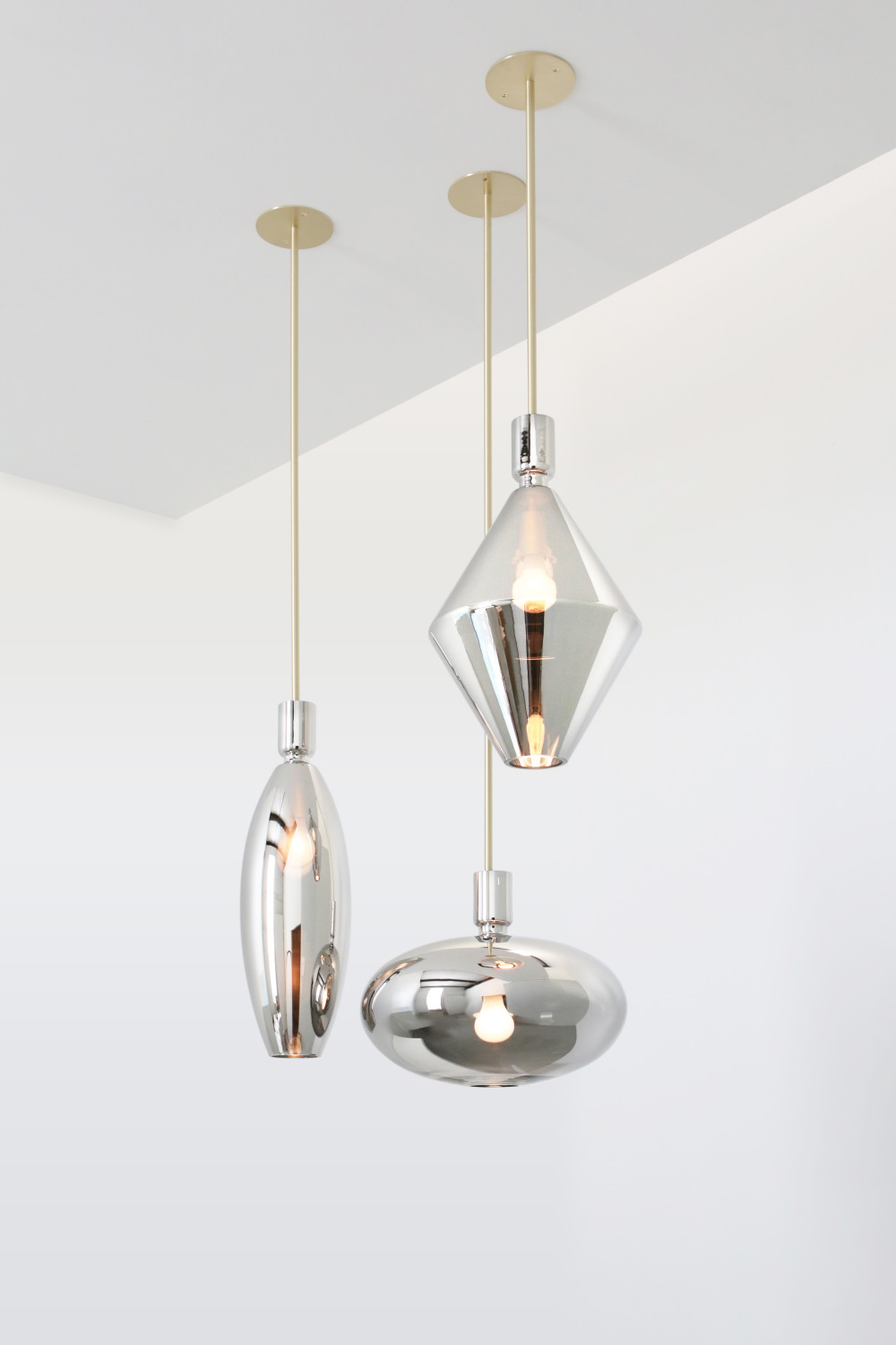 Reflect Pendants are a series of mirror-plated glass pendants in different geometric shapes suspended on rigid brass stems. The glass is mirrored using a unique process that produces an opaque mirror appearance when the light is off but allows light to pass through when on. Each shape has an open mouth at the bottom, the hole ground, and polished. The glass sits on a rest at the end of the stem and lifts to expose the socket for changing the bulb. Available in three different shapes. Glass available in silver mirror finish only.