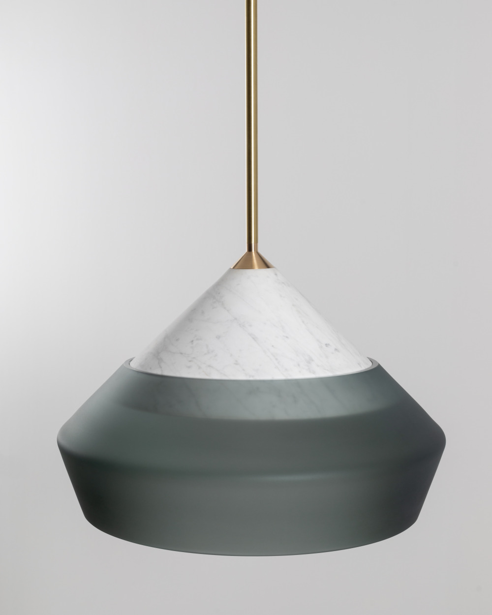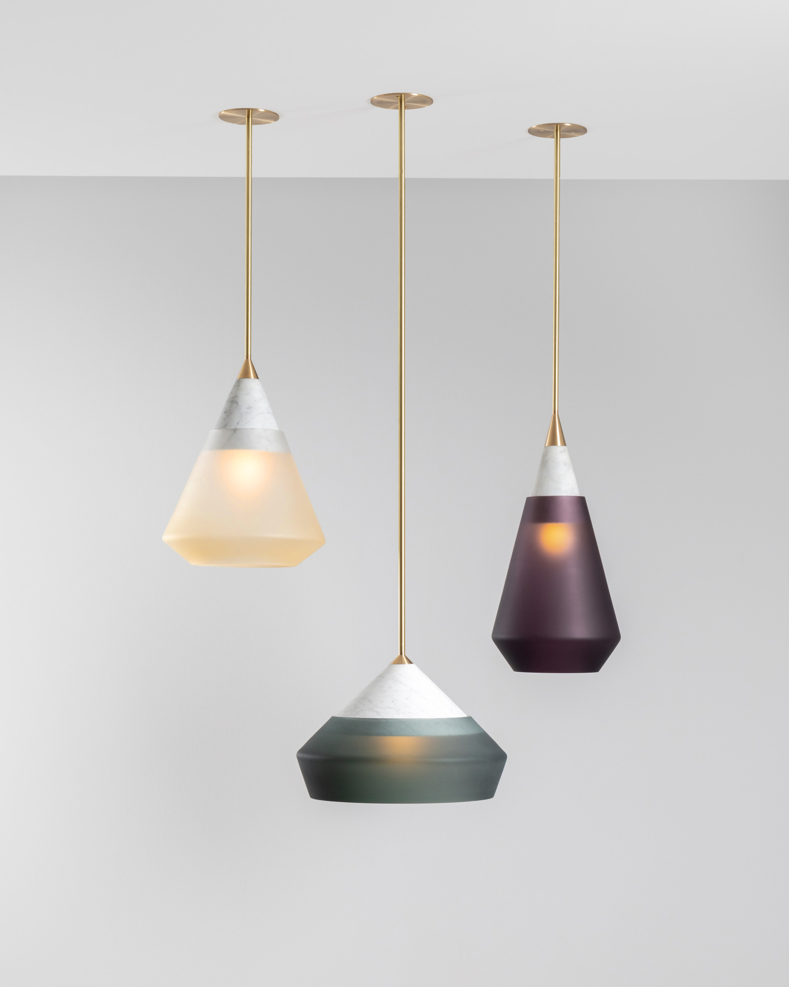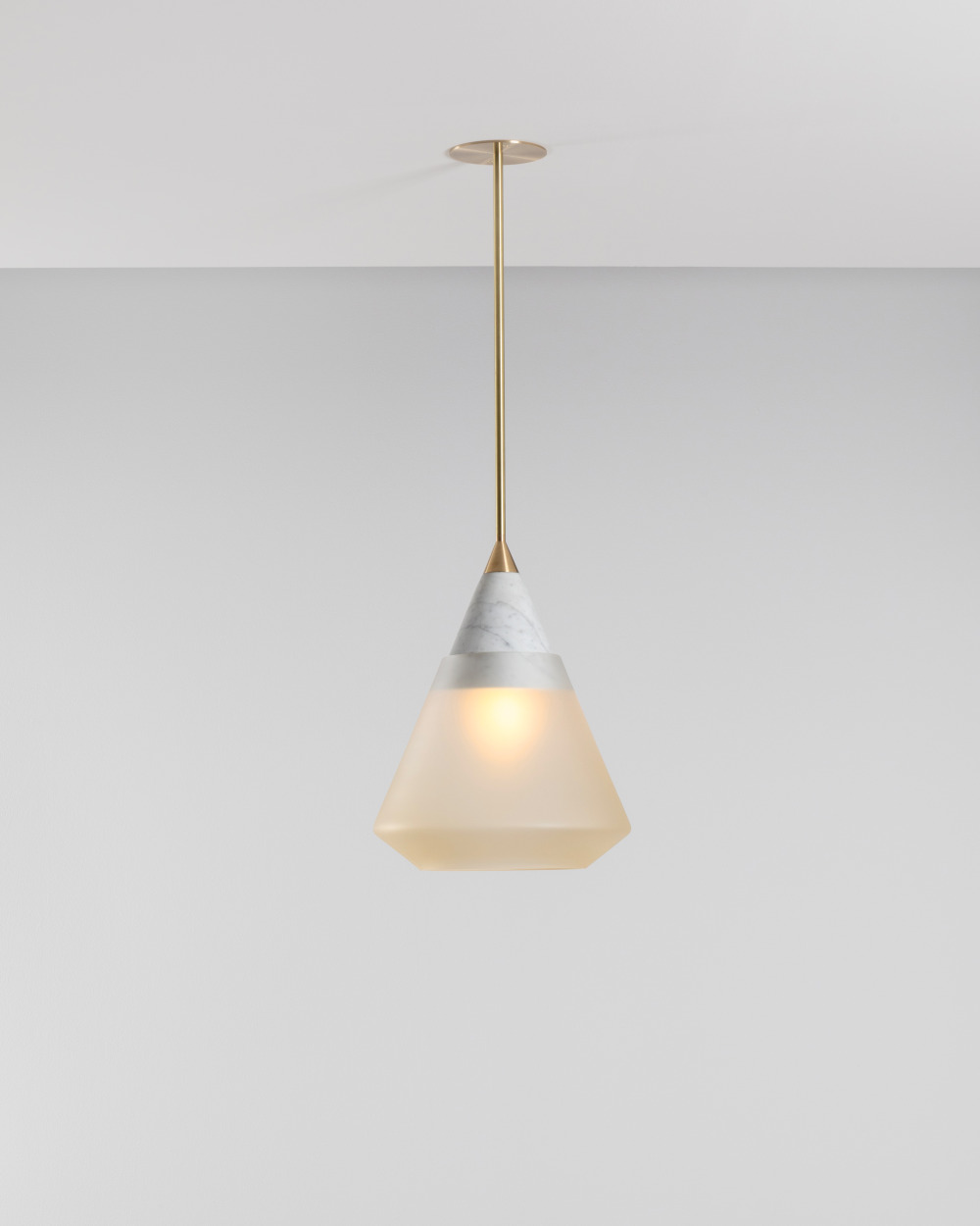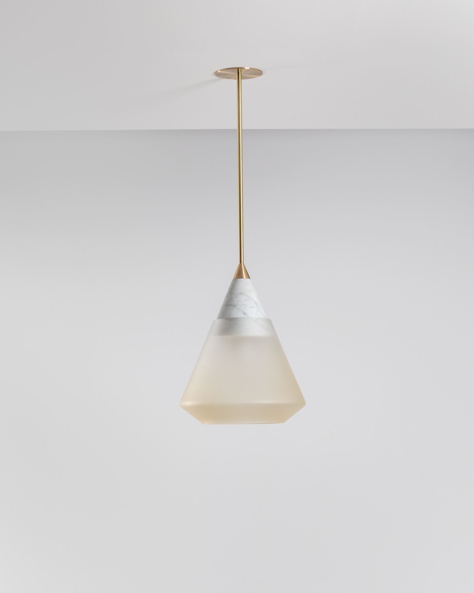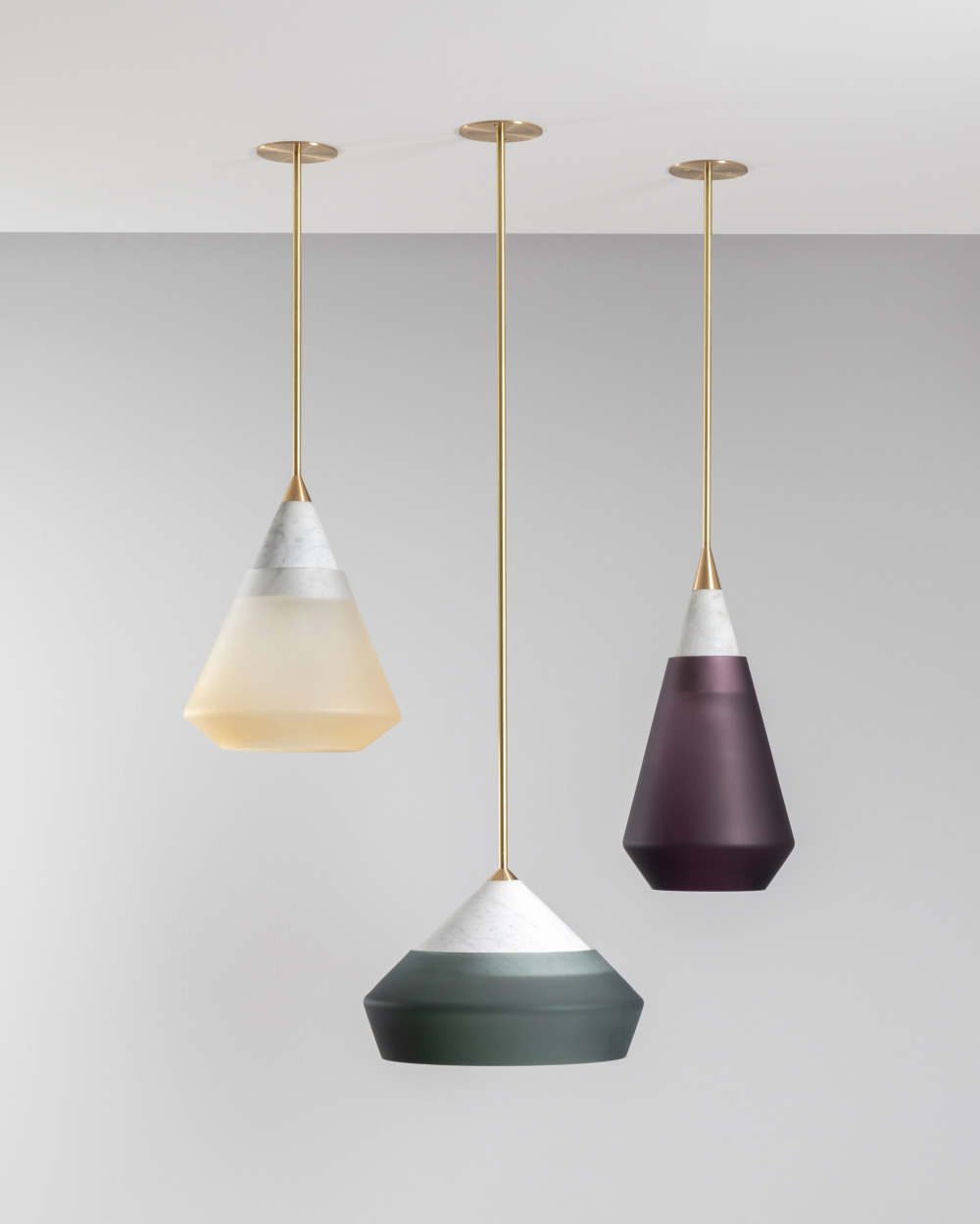 Rest Pendants are conical shapes of honed carrara marble that support frosted handblown glass shades. Each is topped with a custom brass finial and suspended on a rigid brass stem. The glass shades have an angular geometry that bevels inward at the bottom. The three unique shapes have different proportions and angles, yet all share the same language, making them natural partners when used in groups within the same space. These are timeless and elegant fixtures. The pairing of metal, marble and handblown glass gives them a classic presence.