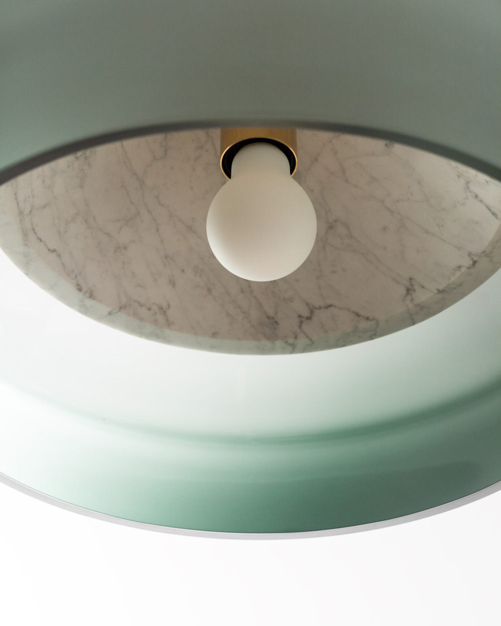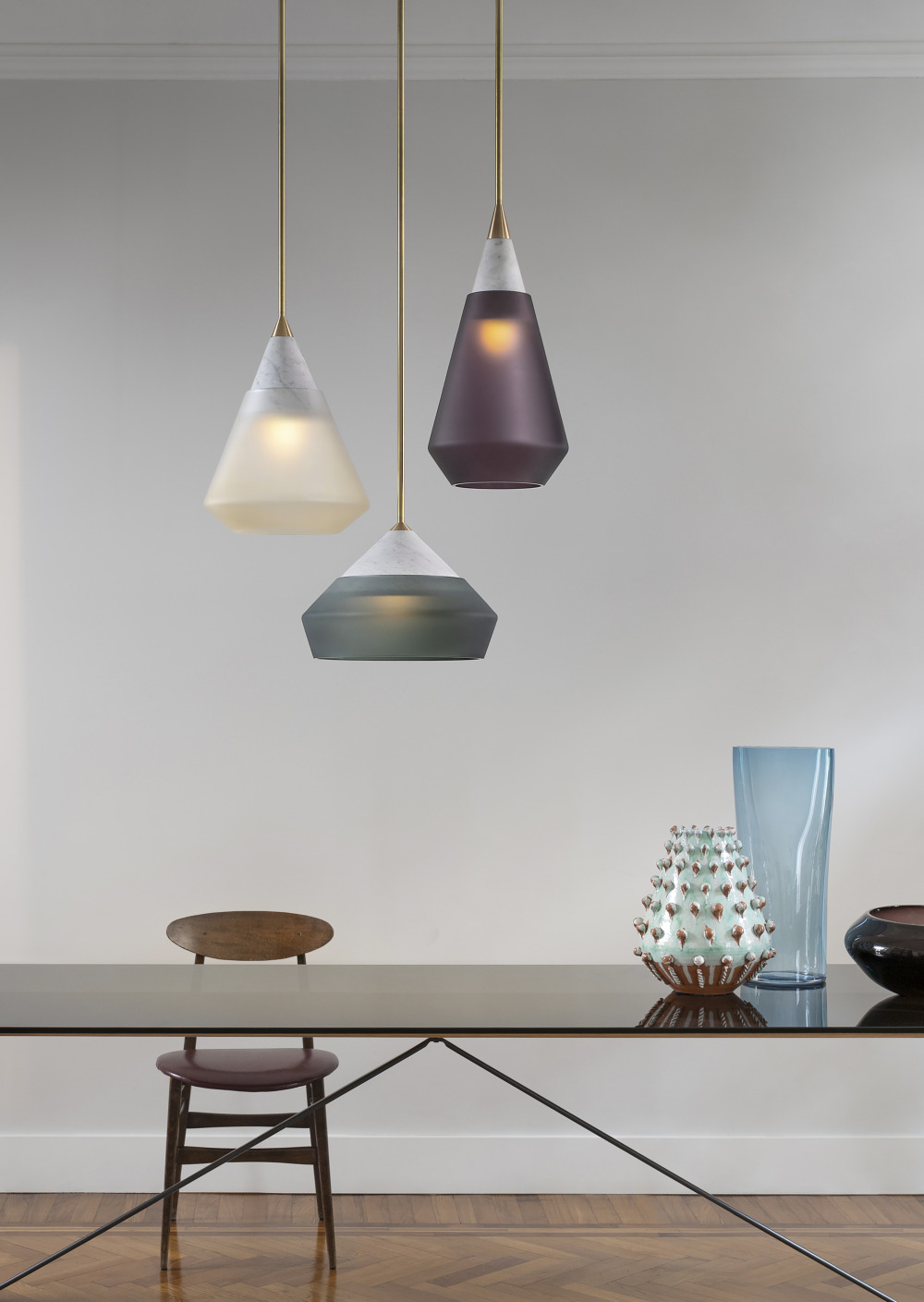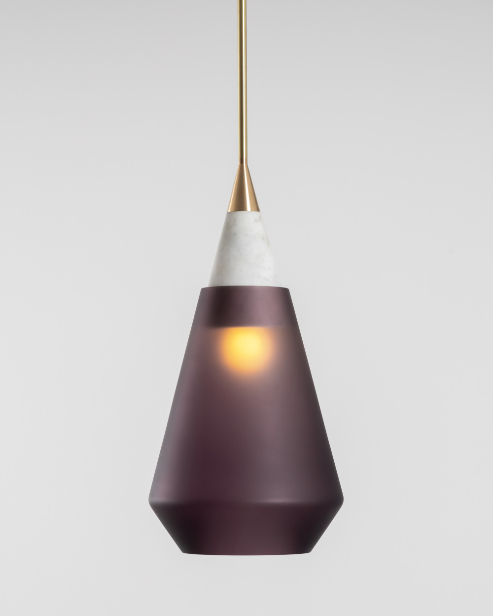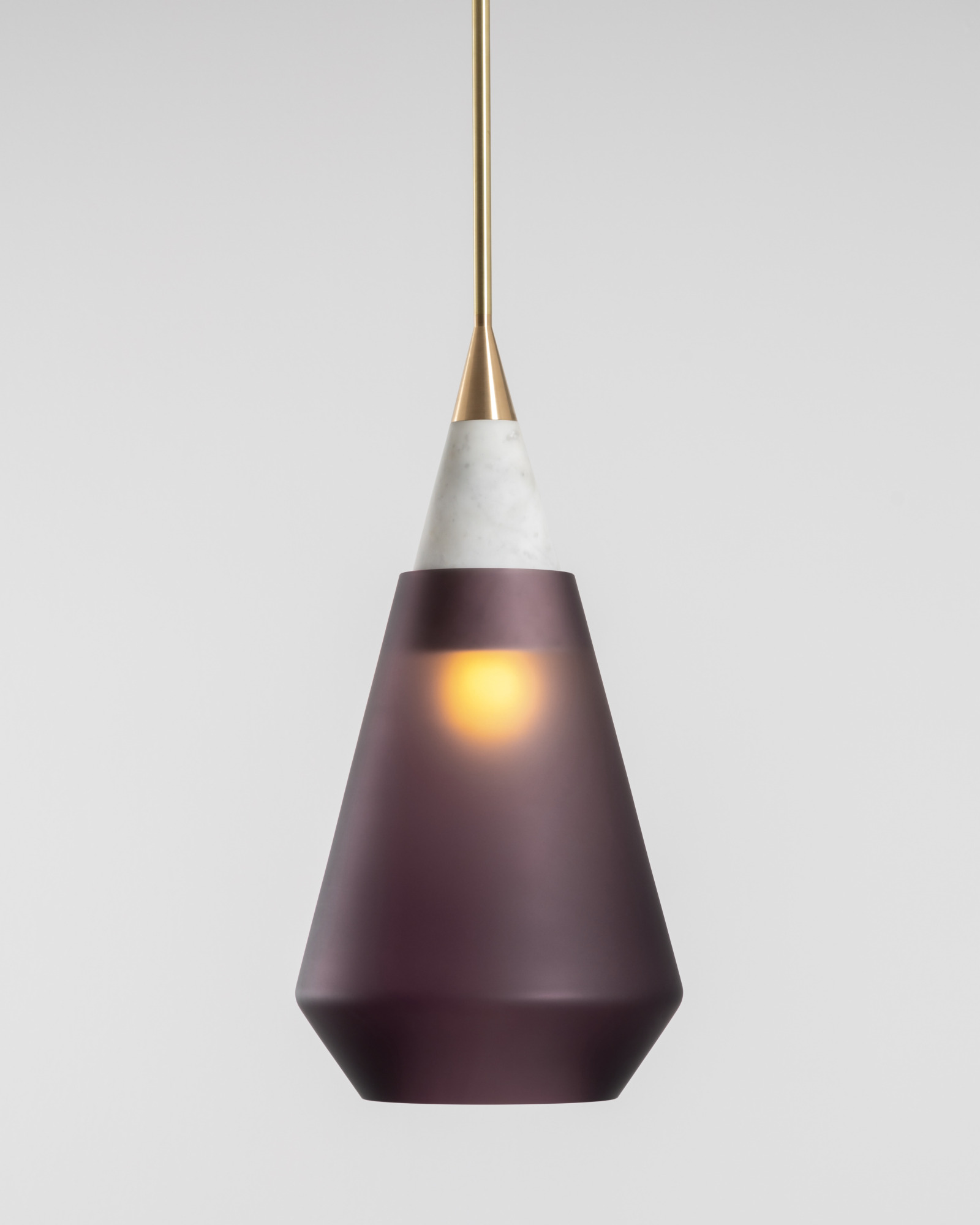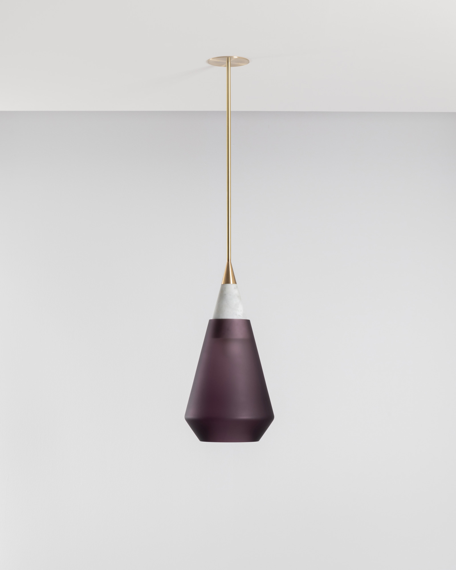 Rest Pendants are conical shapes of honed carrara marble that support frosted handblown glass shades. Each is topped with a custom brass finial and suspended on a rigid brass stem. The glass shades have an angular geometry that bevels inward at the bottom. The three unique shapes have different proportions and angles, yet all share the same language, making them natural partners when used in groups within the same space. These are timeless and elegant fixtures. The pairing of metal, marble and handblown glass gives them a classic presence.