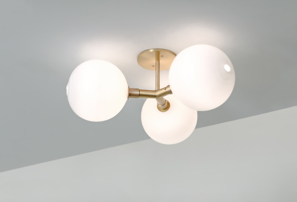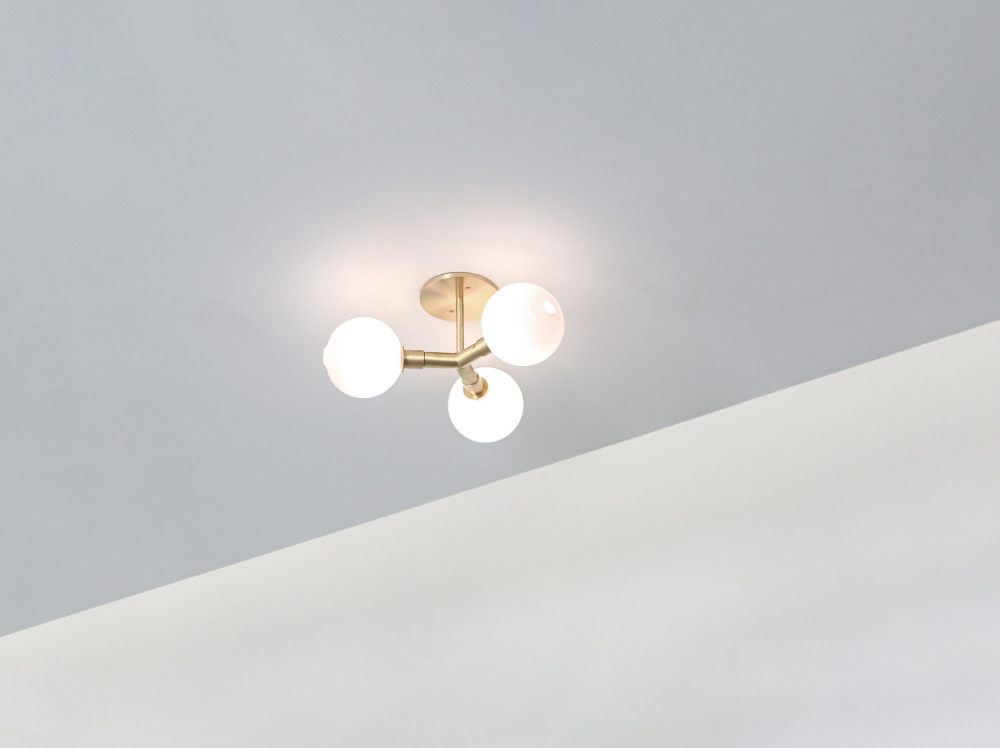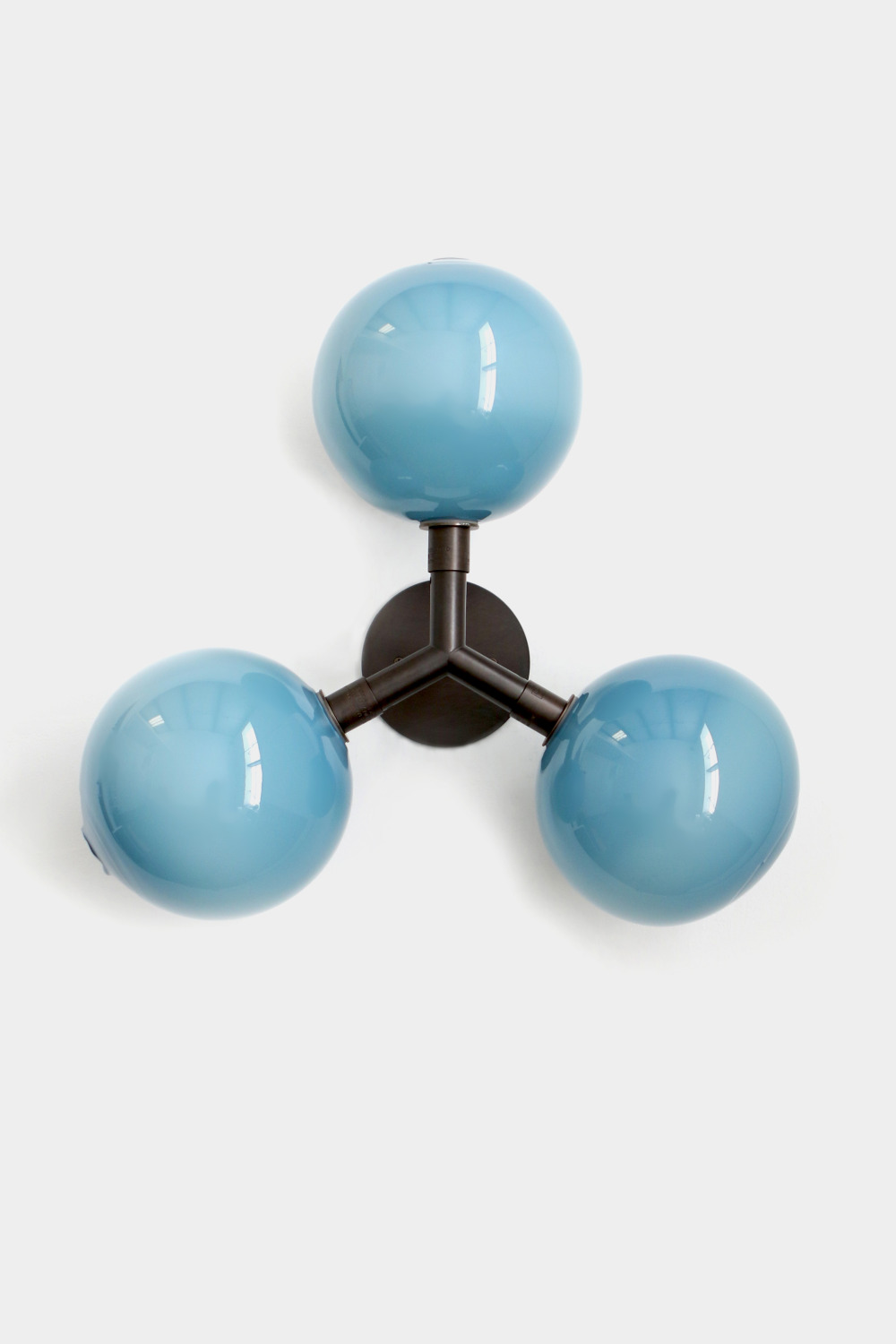The Stem 3X Sconce/Ceiling is a minimal light consisting of 3 4.5"/110mm diameter diffusers of handblown Czech glass on a 3-arm brass structure. Suitable for use as a ceiling light or as a wall light. The glass diffusers are available in both "dipped" glass, featuring the SkLO double-dipped flame-polished mouth and "textured" glass, featuring a soft, frosted finish and subtle sculpted vertical ridges.