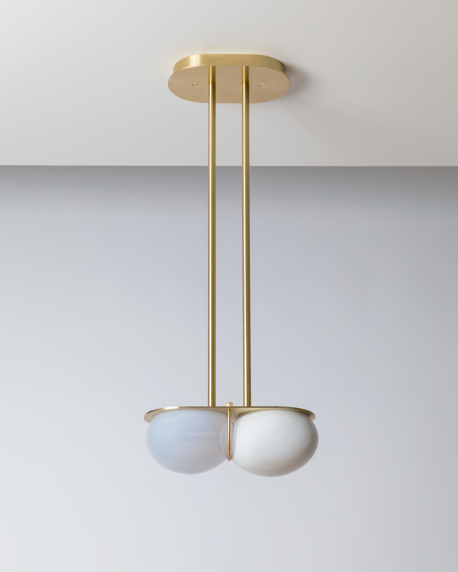A two-tone diffuser of handblown Czech glass made up of two flattened spherical shapes in two colors which are melded together while hot on the glass blower’s pipe. The glass is held to a solid brass canopy by a brass band that sits at the “waist” between the two spheres. Each sphere is lit from within by its own bulb, one in each sphere. Suspended on two rigid brass tube stems from a canopy whose shape mimics the geometry of the pendant itself. All glass dimensions are approximate – handblown glass dimensions vary by nature and intent. Made in the Czech Republic.
