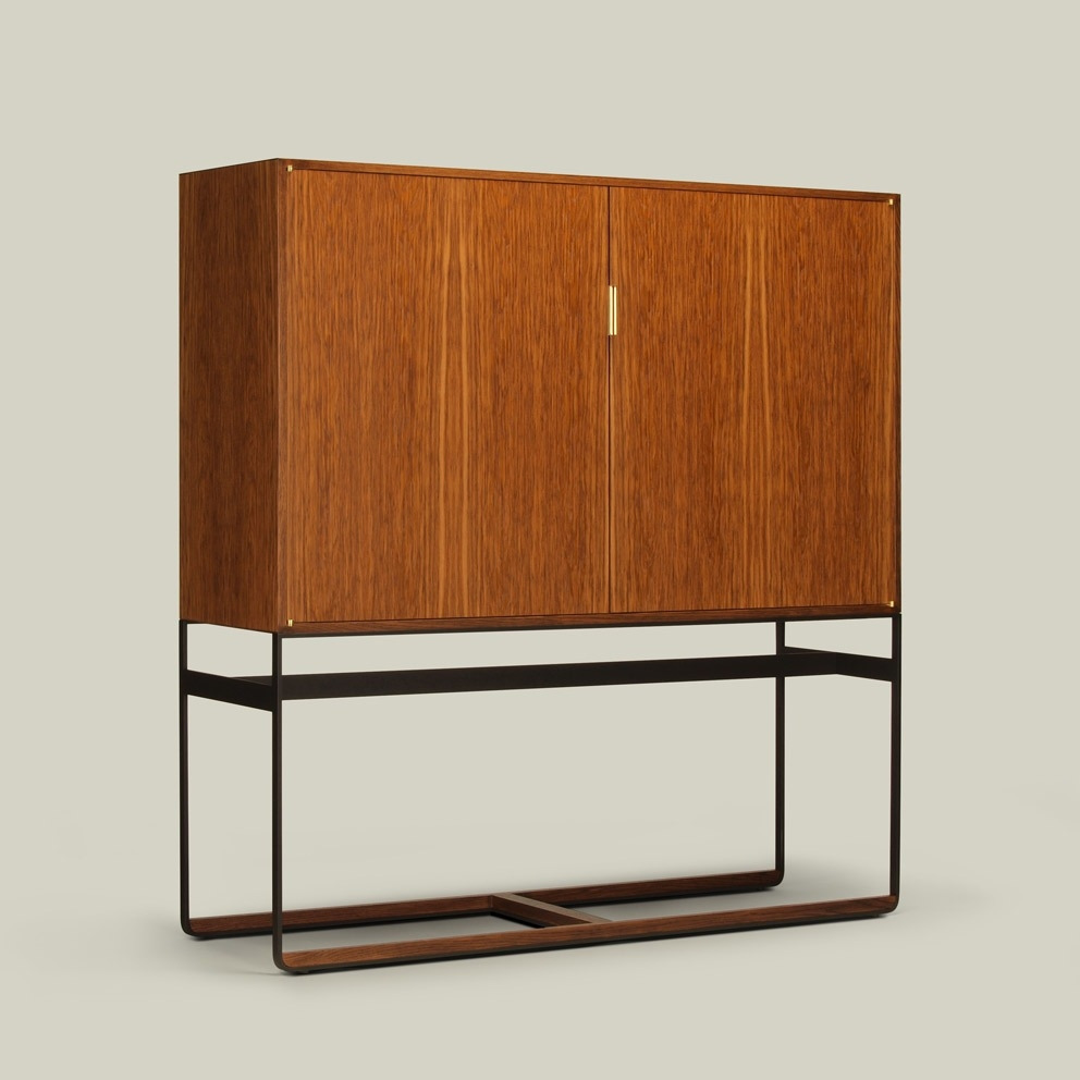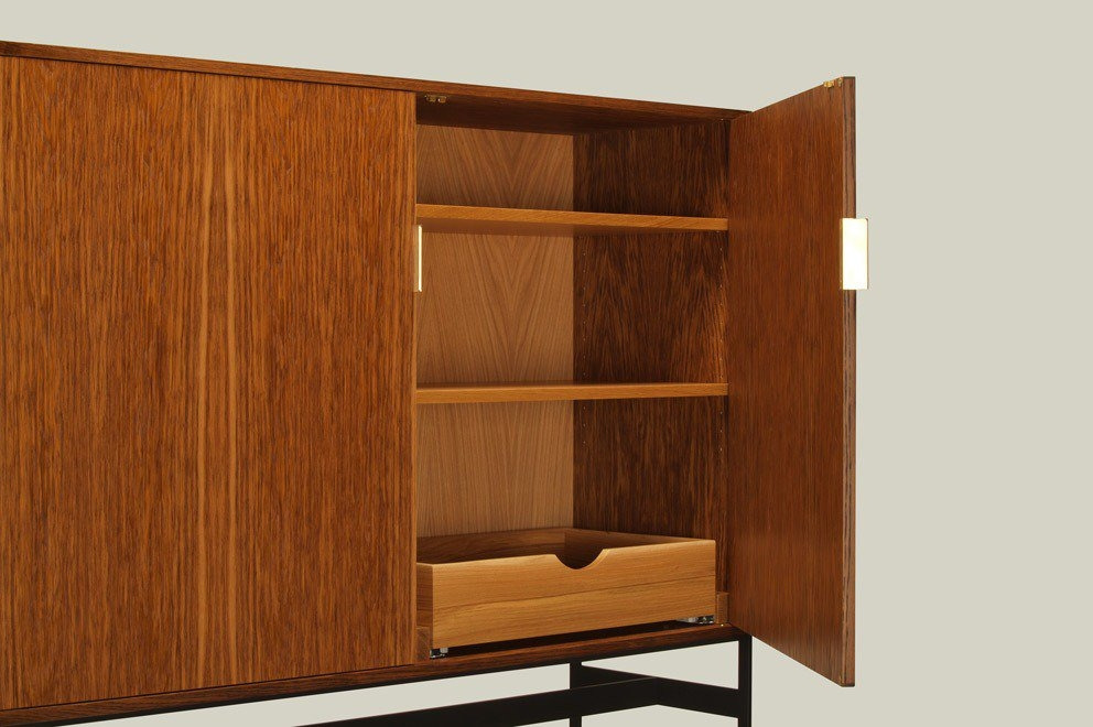 The piedmont cabinet-on-stand is offered in 2 models: standard (ST) or limited edition (LE). Both models feature 2 doors in hand-matched longwoods (ST) or burls (LE) on precision machined offset knife hinges with solid timber inlaid corners and edges