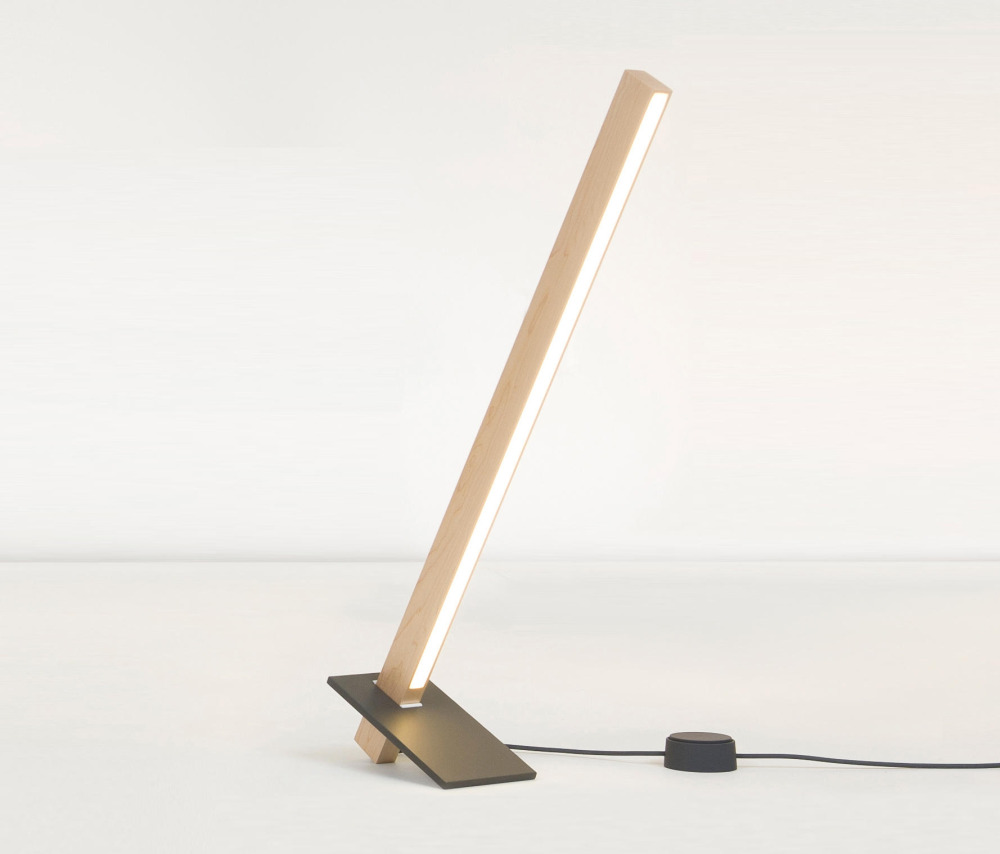 The wooden component is offered in sustainably sourced maple or walnut, reclaimed heart pine, ebonized oak, or reclaimed water tower redwood. The metal base is available in powder coated white, slate grey or matte black, hand blackened steel, polished nickel or brass, or brushed nickel or brass.