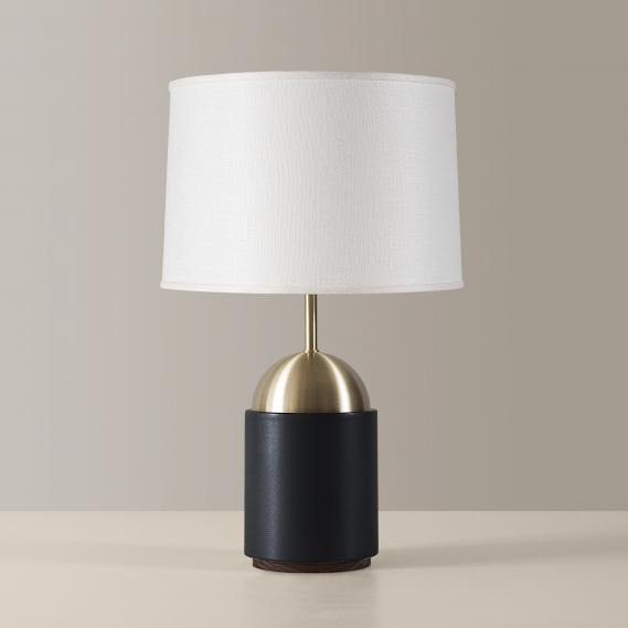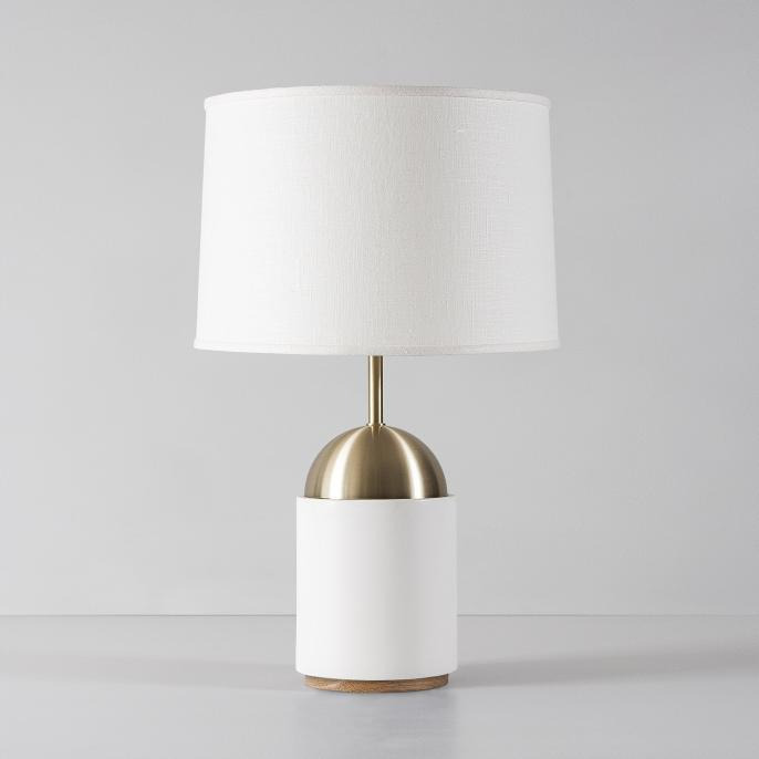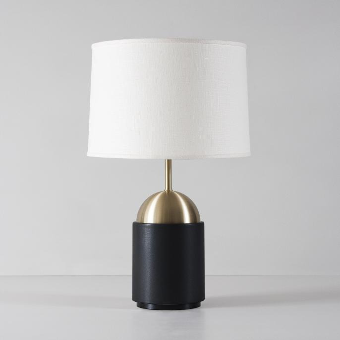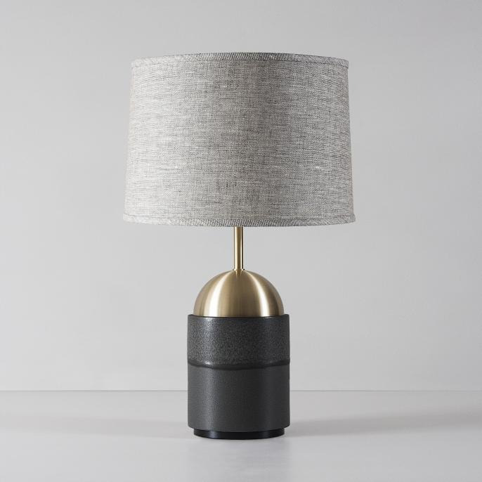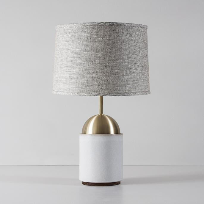Handcrafted stoneware lamp body available in Fossil Gray, Pigeon, White Quartz, Charcoal and Obsidian. The Noor table lamp is available in Walnut, ebonized Walnut, or White Oak with satin brass hardware. Lampshades are 100% natural linen in cream or natural.