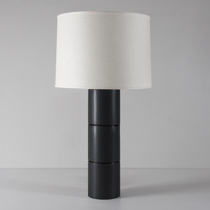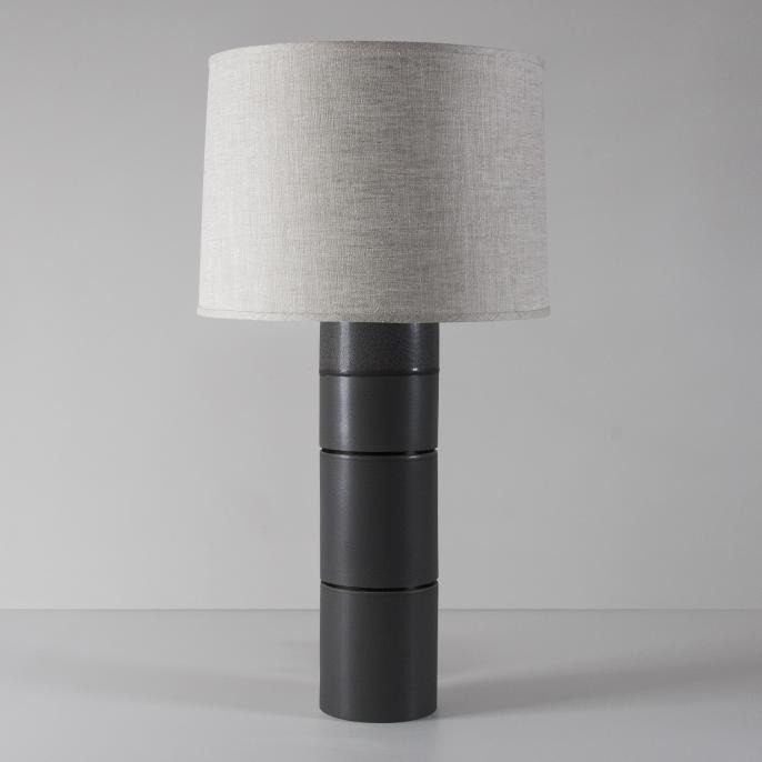 Handcrafted stoneware lamp body available in Fossil Gray, Pigeon, White Quartz, Charcoal, Obsidian and in our hand-carved Canyon finish. The Parker table lamp is available with hand finished blackened brass or satin brass hardware. Lampshades are 100% natural linen in cream or natural.